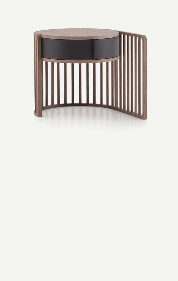 The rustling of the wind echoes in the silence of nature: a visual reference to canes, creating light, evocative and reassuring pieces of furniture. The new Palù collection portrays a concept of small-scale architecture, formed from the relationship between presence and absence. The distinctive features of these complements, a bedside table and bench seat, are the linear effect of solids and empty spaces, and profound harmonies. The curves created using a sequence of wooden rods define the space, indicating the sense of the limit in a neat and feminine series. The frame embraces suspended volumes, made out of air: an upholstered seat, a Vienna straw shelf, elegant drawers. In the bedside table, the round drawer rotates towards the bed, transforming into a second shelf.