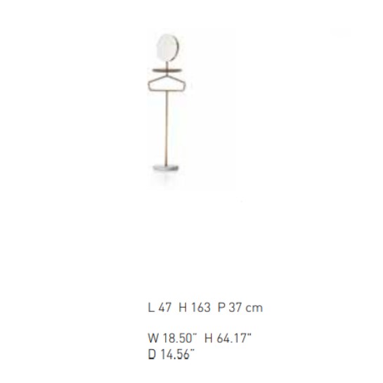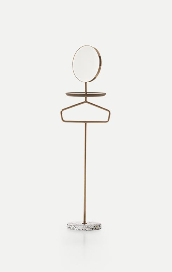 A collection of functional and elegant accessories, Contralto wears its pared-back, linear look as a distinguishing feature. The series comprises mirror, side tables and valet stands. The latter all share a common specific detail giving them their distinctive character: a terrazzo plinth serving as the base supporting a sleek, slender metal stem that has a series of elements branching off it at the ideal height for practical use. The resulting forms are fluctuating sculptural volumes, often portable, invariably full of life, designed to simplify those little everyday actions. All shelves and set-down spaces are made from turned and smoothed ash to provide a lovely tactile quality and prevent damage of any kind to whatever item of clothing or other object is placed on them, no matter how delicate. These pieces can be tailored to individual requirements, choosing any of the Pianca wood options.