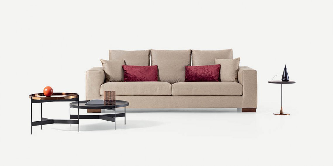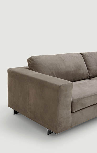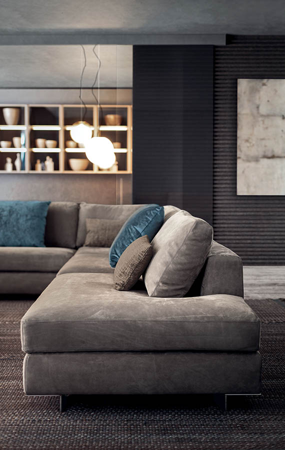 Perfect rhythm. Thanks to a thorough score of modules, Palio plays out its class beautifully. Large volumes, modern lines, balanced proportions make for an impeccable and comfortable design. There are two backrests: one features wide, low cushions and the other tall, narrow ones, plus a rear roll cushion for thorough low back support. The base boasts a new look consisting in elegant, blade-profile feet or concealed ones. The collection offers extensive modularity including straight, side, corner and peninsula modules, a chaise longue, an armchair and an ottoman.