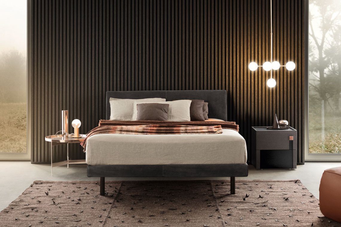 Delicate shades reveal the strength of those who know how to play the co-star. An interplay of elements complementary to the other furniture in the room creates a perfect chorus of harmonious voices. A simple, elegant design offers a multitude of customisation options. The soft, padded headboard is upholstered in fabric, leather or man-made leather just like the divan and the bed base frame in the classic version. The feet are available in wood, with a metallic finish, or in the matt lacquered colors of collection.