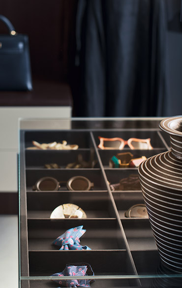 The Island module appears like a dreamy oasis in the middle of the room: an island for walk -in closets evoking the most exclusive boutique furnishings, directly in your home sea. Thanks to the possibility of being equipped with draw ers, shelves and shoe-racks, it’s an useful and versatile shelter for any kind of wardr obe; moreover, it offers space for jewels and valuables, or for emotional and simple but priceless memories, inside an elegant display cabinet that comfortably contains and safeguards your most precious treasure.