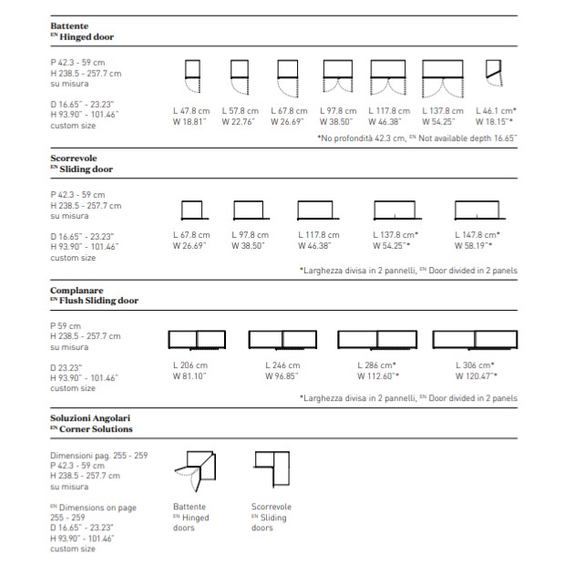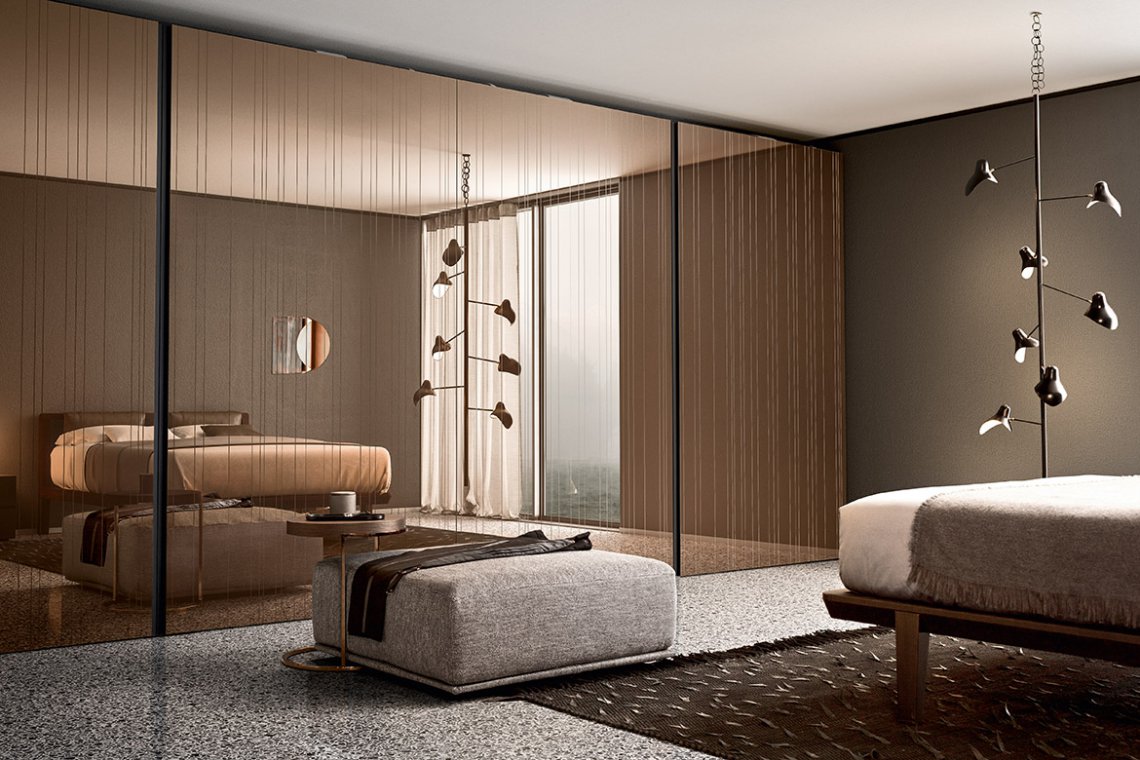 Lush, eccentric and elegant, embellishments steal the show. Vertical incisions run across the surface of the door, alternating like discontinuous rays of light that sketch dynamic, parallel lines. Gloss or matt, they beautify the glass or mirrored door surfaces. The handles run along the whole height of the inner door edge and come in a lacquered aluminium or metallic finish.