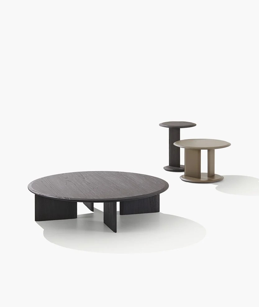 With a choice of a square or rectangular top with rounded corners or a round top, it comes in different heights and sizes. In the olmo nero version, the thickness of the tabletop is the result of hand crafting. The round and tall version of the coffee table, which is ideal for placing next to the Brera sofa, is also available completely covered in leather.
