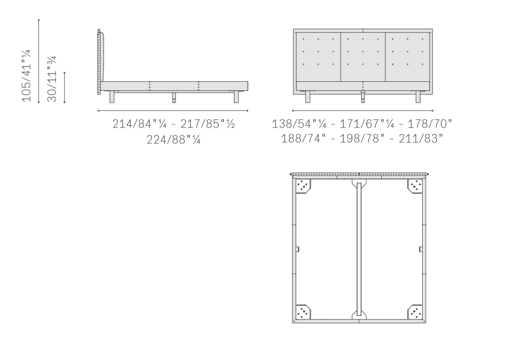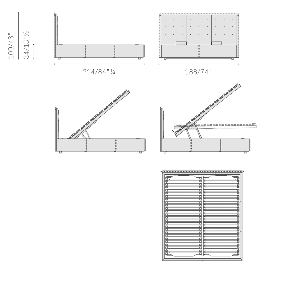 GranTorino Coupé Bed床的床頭結構為樺木膠合板,柔軟的絎縫包墊中填充聚酯棉。床欄使用杉木條,床腳板使用楊木膠合板,略微填充聚氨酯泡沫。GranTorino Coupé Bed覆層使用Pelle Frau?軟皮,將皮革與軟皮或布藝相結合以及將軟皮和布藝相結合的版本中,則是:床頭后側和床架使用Cuoio Saddle Extra皮革或Pelle Frau?軟皮,絎縫覆層使用Pelle Frau?軟皮或可拆洗布藝。使用對比色縫線手工制作的精致X型縫線令絎縫表面更加豐富。皮革版本使用突出縫線,齊整剪裁的皮革手工縫合。圓柱形鋁制支腳覆蓋Pelle Frau?軟皮或黑色噴漆。Gran Torino Coupé Bed床也提供搭配收納倉的版本。開啟系統允許通過兩種不同方式打開收納倉。除了常見的垂直升高床面之外,還可水平升高,便于整理床鋪。兩種機械系統均配備安全止動。收納倉基座采用中密度木質纖維板。