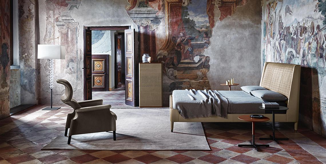 50年代的浪漫喜劇電影,以及更早之前的18世紀(jì)的奢華壁龕。這樣的氛圍就是Suzie Wong床的靈感源泉。Roberto Lazzeroni將其想象為輕盈、富有女性特質(zhì)、打扮精致的模樣。Suzie Wong的參照款式是經(jīng)典的船型床,采用極為現(xiàn)代的解讀方式,令形狀更加簡潔。支腳纖細(xì)如高跟鞋的細(xì)跟,覆蓋軟皮,配有黃銅包頭,將床從地面上抬起,彰顯其輕盈感。外覆軟皮絎縫的床頭版本更加復(fù)雜,繡有精致的幾何針腳,細(xì)膩呼應(yīng)裁縫和小皮具加工的典型技法。