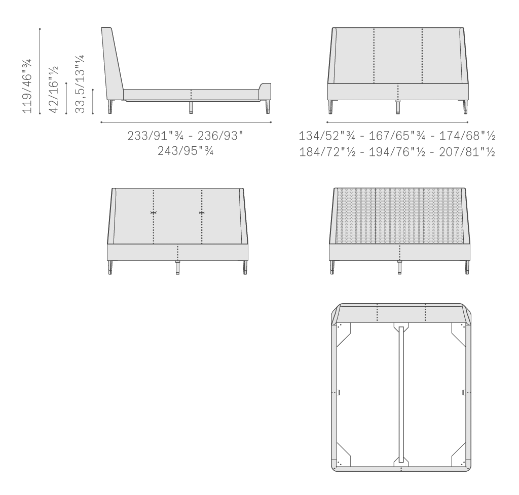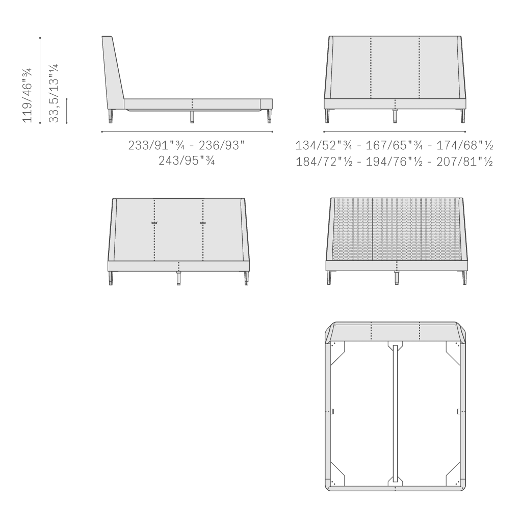 Suzie Wong床中,床頭結(jié)構(gòu)填充聚氨酯泡沫,使用櫸木實(shí)木和樺木膠合板制作。可以選擇三種表面處理:Suzie Wong,特色在于光滑床頭,Suzie Wong Extra,帶有光滑床頭,并飾有一對圓柱形扣子,覆蓋同色深淺軟皮,或Suzie Wong De Luxe,特色在于飾有幾何圖案刺繡的床頭。兩個(gè)塑型側(cè)面部分使用印壓聚氨酯泡沫。床欄使用北美鵝掌楸,略微填充聚氨酯泡沫。床腳板使用楊木膠合板,兩個(gè)轉(zhuǎn)角使用印壓聚氨酯泡沫。覆蓋Pelle Frau?軟皮。除了纖細(xì)且覆蓋軟皮的支腳之外,還可以使用摩卡色或雞翅木色梣木實(shí)木。床腳板也有兩種款式,高款或低款,后者與縱向床梁等高,構(gòu)成連續(xù)表面。