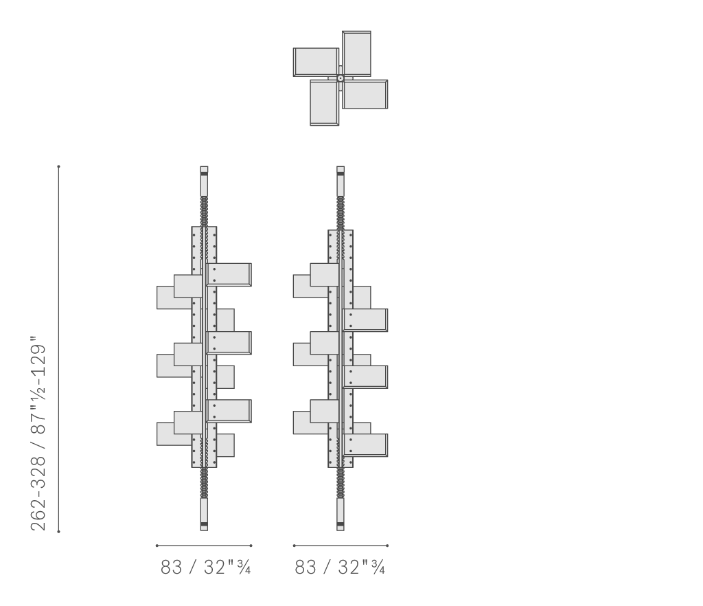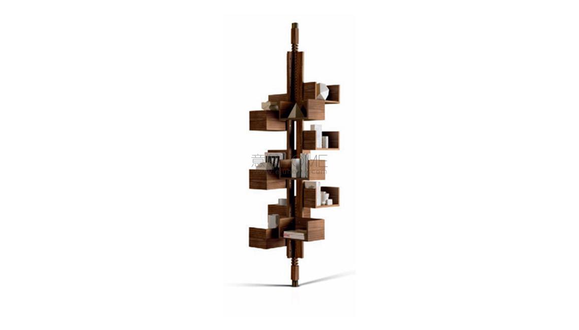 其結(jié)構(gòu)特色一方面來自復(fù)雜的細(xì)木工藝,另一方面則出于雕塑技法的使用,另其成為空間中的核心元素。Albero書柜的支撐結(jié)構(gòu)采用黑核桃木實(shí)木。由兩根咬合方柱構(gòu)成,采用特殊的齒軌式嵌套,此外還有四根垂直支柱,帶有調(diào)節(jié)孔,可以根據(jù)喜好安裝八個(gè)或十二個(gè)架板。這些架板使用中密度木質(zhì)纖維,鑲貼實(shí)木片。天花板和地面處的包頭安裝在咬合方柱兩端。上側(cè)包頭嵌在固定在天花板上的“圓管”內(nèi)。下側(cè)包頭通過防滑橡膠確保緊貼地面。在固定包頭中配備的四個(gè)金屬箍筋的作用下,實(shí)現(xiàn)書柜的固定。固定件的表面處理(包頭和圓管)為仿舊鍍色鋼。下側(cè)咬合方柱上,激光鐫刻設(shè)計(jì)師簽名和Poltrona Frau徽標(biāo)。Albero書柜可360°旋轉(zhuǎn)。如有需要,架板平面可以添加厚度4毫米、帶有同色深淺染色邊框的Cuoio Saddle皮革墊層,起到裝飾和保護(hù)作用。墊層四周有手工鐫刻裝飾以及Poltrona Frau熱印徽標(biāo)。