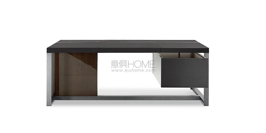 Jobs President Desk寫字臺桌面覆蓋Pelle Frau?軟皮,搭配鉛色或煙草色無梗花櫟木條,整個長度上使用啞光表面處理,將工作區域和“客戶區域”分開。“客戶區域”可以覆蓋Pelle Frau?軟皮,與桌面其他部分相搭配,或使用鉛色或煙草色啞光無梗花櫟木貼面,與支桿或收納柜相搭配。桌面也配有滑門,可以露出一個小型內部隔槽,與筆架托盤相連,也可方便走線。