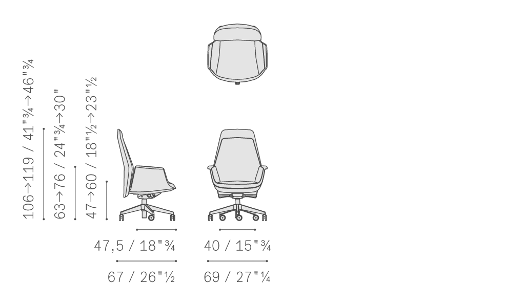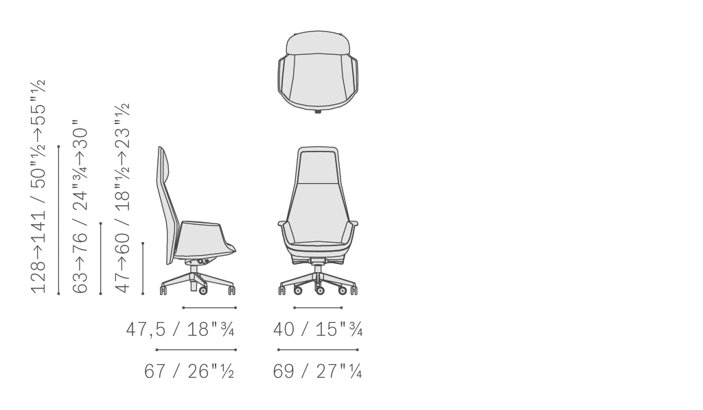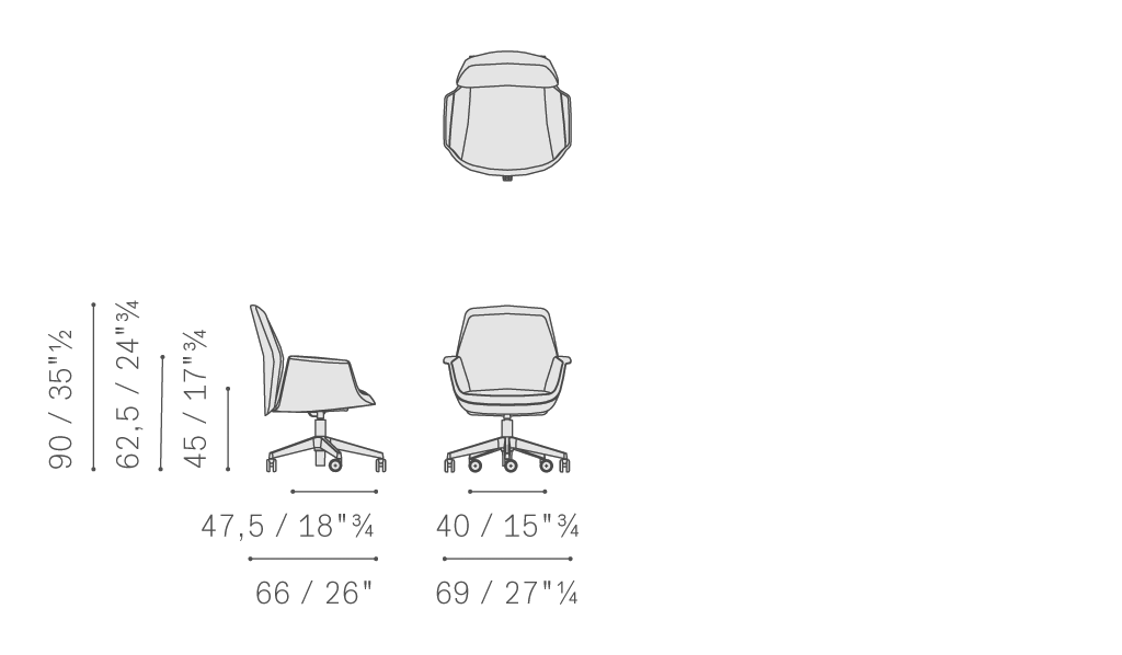 DownTown扶手椅分為5種款式:President、Executive、Managerial、Meeting和Visitor。表面覆蓋Pelle Frau?軟皮,裝飾同色深淺縫線或?qū)Ρ壬p線,同時也有在靠背墊、扶手和靠墊內(nèi)表面采用微孔工藝的版本。支承底座使用拋光或黑色噴漆,在President、Executive、Managerial和Meeting版本中由5個支腳座城,配有“W”型軟質(zhì)自轉(zhuǎn)自鎖輪,適合各種類型的地面。Visitor版本則使用四支腳底座,配有塑料旋轉(zhuǎn)滑槽,如有需要也可為其它版本配置。DownTown扶手椅可以調(diào)整高度,也可以圍繞自身旋轉(zhuǎn),此時需要向上提拉位于座椅右側(cè)下方的手柄。President、Executive和Managerial版本在靠背和座椅上配有“Syncron”振蕩機(jī)械系統(tǒng),使得扶手椅能夠極為輕松的跟隨身體動作,適應(yīng)身體移動,保證超高的舒適性。扶手椅機(jī)械裝置可以鎖定在4個位置上。DownTown Meeting可以憑借推力滾珠軸承圍繞自身旋轉(zhuǎn)。DownTown Visitor配有自歸位旋轉(zhuǎn)機(jī)械系統(tǒng),可以憑借推力滾珠軸承使得扶手椅圍繞自身旋轉(zhuǎn)并回到初始位置。