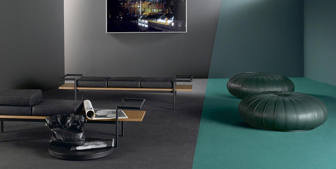 Esedra圓沙發(fā)凳內(nèi)部結(jié)構(gòu)為樺木膠合板和櫸木實(shí)木。底座為漆木,使用黑色防劃壓花漆料。包墊中使用聚氨酯泡沫和聚酯棉。覆蓋Pelle Frau?軟皮。