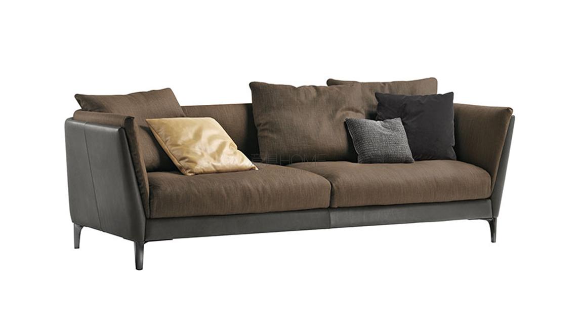 Bretagne沙發的和諧設計是不同材質之間細微、成功平衡的結晶:舒適而深厚的坐墊,搭配多個覆蓋可拆卸布藝的柔軟靠墊,主體則規整精簡,覆蓋Pelle Frau?軟皮。鋼制條板,采用槍管色表面處理,貫穿整個后側,在扶手和靠背連接點上帶來輕盈裝飾。