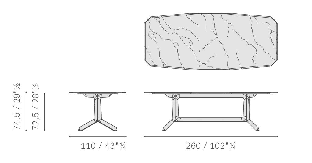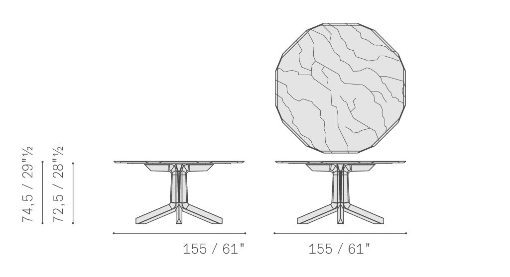 摩卡色或雞翅木色白蠟木實木支撐具有幾何雕塑的效果。相反,無論是圓形版本還是長方形版本,頂面均彎曲而柔軟。Othello桌臺的獨到特點在于其木制結構,邊緣截面呈三角形,與尖角相結合,沿臺面四周,呼應鉆石切割工藝。Poltrona Frau為頂面提供兩種材質款式選擇。煙熏色水晶玻璃臺面輕盈且半透明,彰顯支撐構造的堅實。帕斯高灰大理石是極為珍貴的品種,細膩而豐富的紋理令人無法移開視線,在自然光下展露透光和幾乎透明的區域。或者,也可以使用同樣珍貴的卡拉卡塔金色大理石。水晶玻璃版本的Othello桌臺搭配拉絲不銹鋼外露隔片。大理石版本可以使用拋光或半拋光表面處理,臺面下表面以技術網層加固,確保經久耐用。頂面由層壓HPL倍耐板墊板支撐。