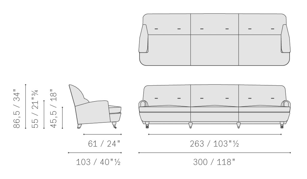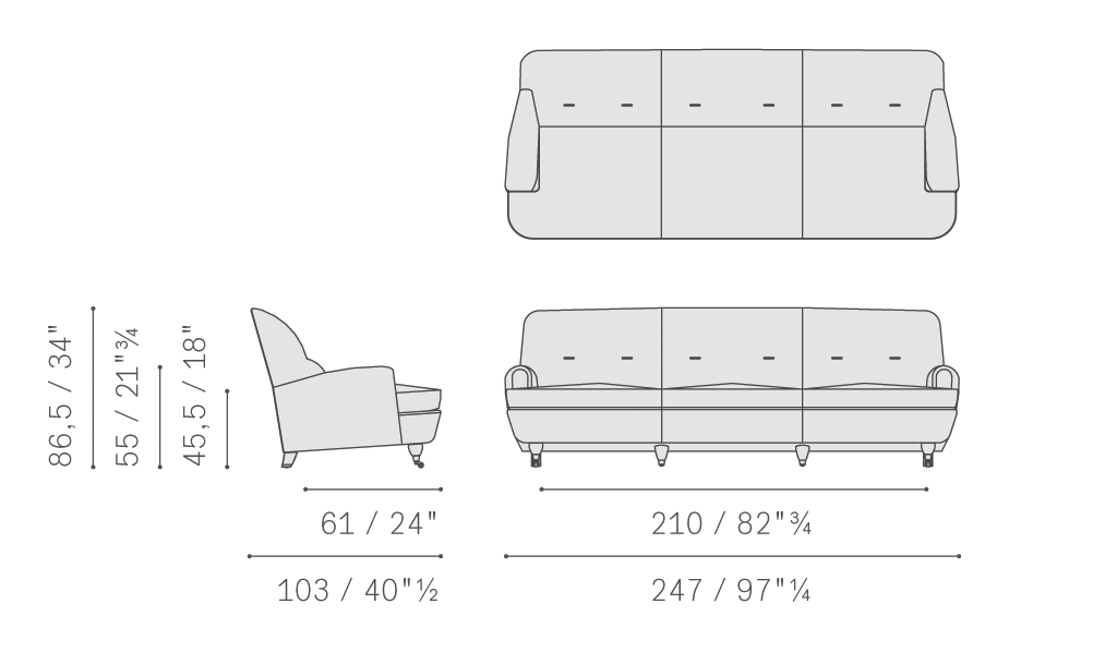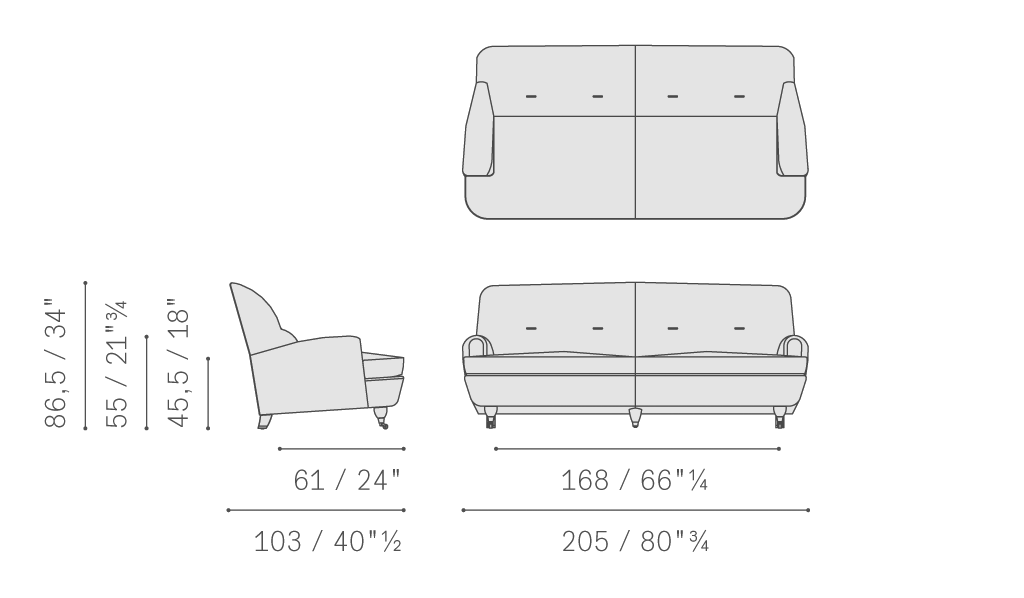 Novecento沙發(fā)和扶手椅支撐結(jié)構(gòu)采用楊木和陳年櫸木。座墊彈簧結(jié)構(gòu)采用手編鋼制雙錐形彈簧,架在黃麻帶上。基座包墊填充涂膠馬鬃和聚氨酯泡沫,而靠背包墊則填充聚氨酯泡沫和聚酯棉,靠墊填充鵝絨。扶手包墊采用印壓聚氨酯泡沫。深胡桃木色櫸木支腳。后側(cè)支腳總是使用鍍鉻黃銅底腳。前側(cè)支腳則配備鍍鉻黃銅自轉(zhuǎn)輪,或與后側(cè)支腳相同,采用鍍鉻黃銅底腳。靠背上Pelle Frau?軟皮覆面添加一對(duì)長(zhǎng)方形皮面扣。