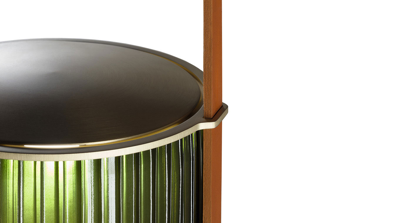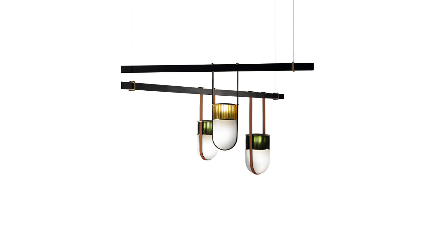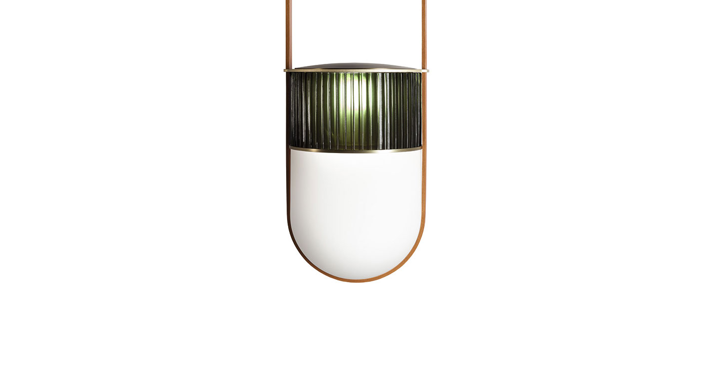 Xi燈具采用吹制玻璃和鞣皮制作,如燈籠般被空間呵護。發光體由兩個吹制玻璃元素構成。上半部分具有特殊的規則而透明羅紋表面,染上琥珀、綠寶石、紅寶石或月光石色。發光體下半部分采用珍珠表面處理,令光線溫暖而分散。這些部件由威尼斯玻璃大師使用彩色玻璃膏吹制而成,每一件均獨一無二。玻璃藝術加工會導致著色深淺差異以及小氣泡,這是產品價值所在,令每一件獨一無二、絕不重復。