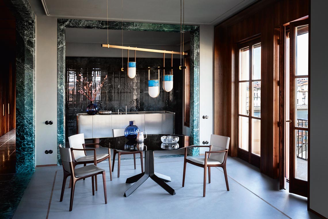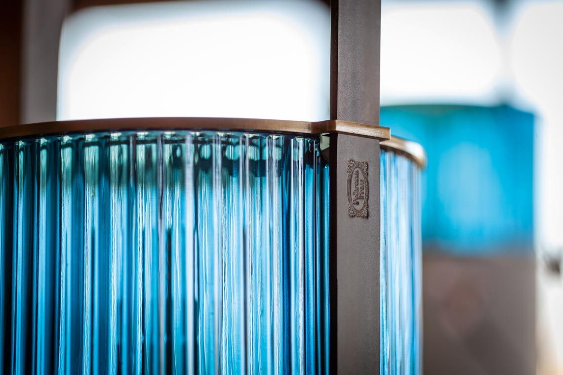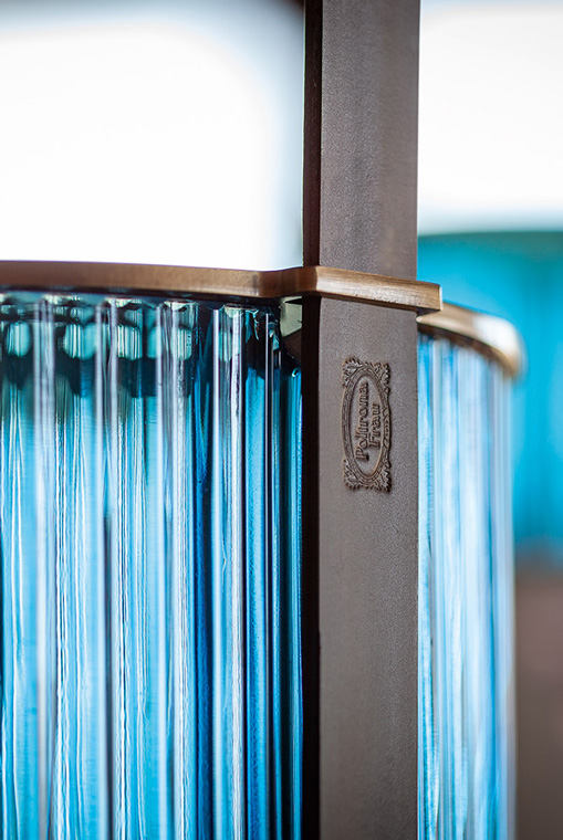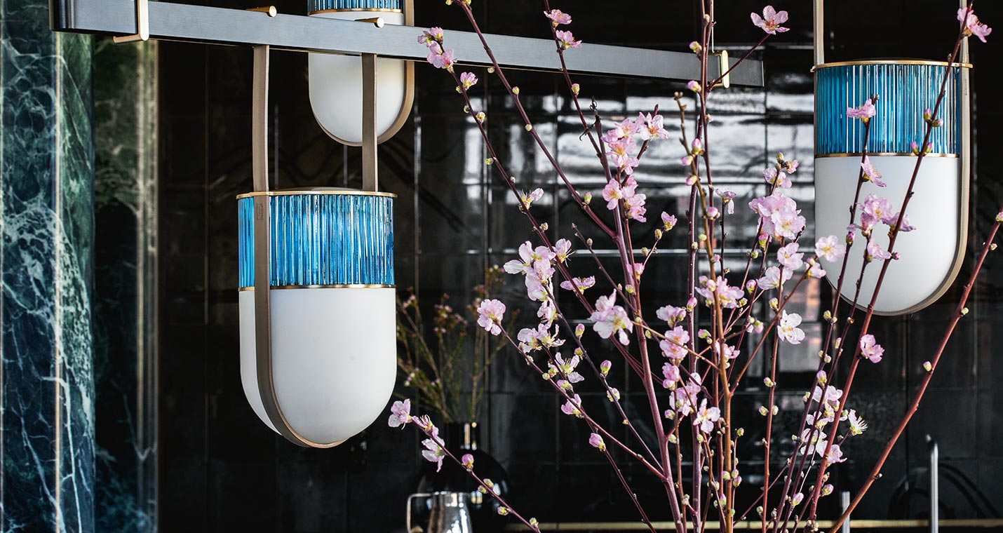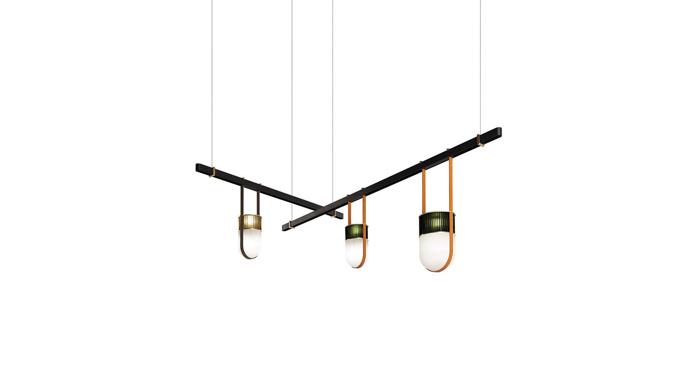 Xi燈具采用吹制玻璃和鞣皮制作,如燈籠般被空間呵護。發光體由兩個吹制玻璃元素構成。上半部分具有特殊的規則而透明羅紋表面,染上琥珀、綠寶石、紅寶石或月光石色。發光體下半部分采用珍珠表面處理,令光線溫暖而分散。這些部件由威尼斯玻璃大師使用彩色玻璃膏吹制而成,每一件均獨一無二。玻璃藝術加工會導致著色深淺差異以及小氣泡,這是產品價值所在,令每一件獨一無二、絕不重復。