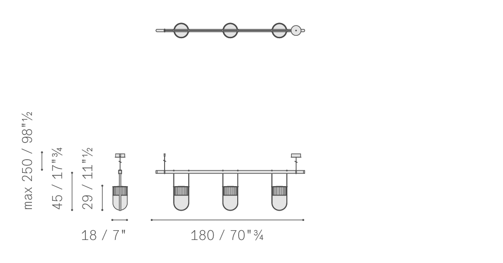 在吊燈版本中,提供單個或多個燈泡的多種組合,Xi燈具可以安裝在高度可調的橫桿上,提供兩種長度,130cm和180cm,采用啞光槍管色表面處理,電纜線為黑色。吊桿采用軌道式結構,允許水平移動燈具,并可將其固定在所需位置上。