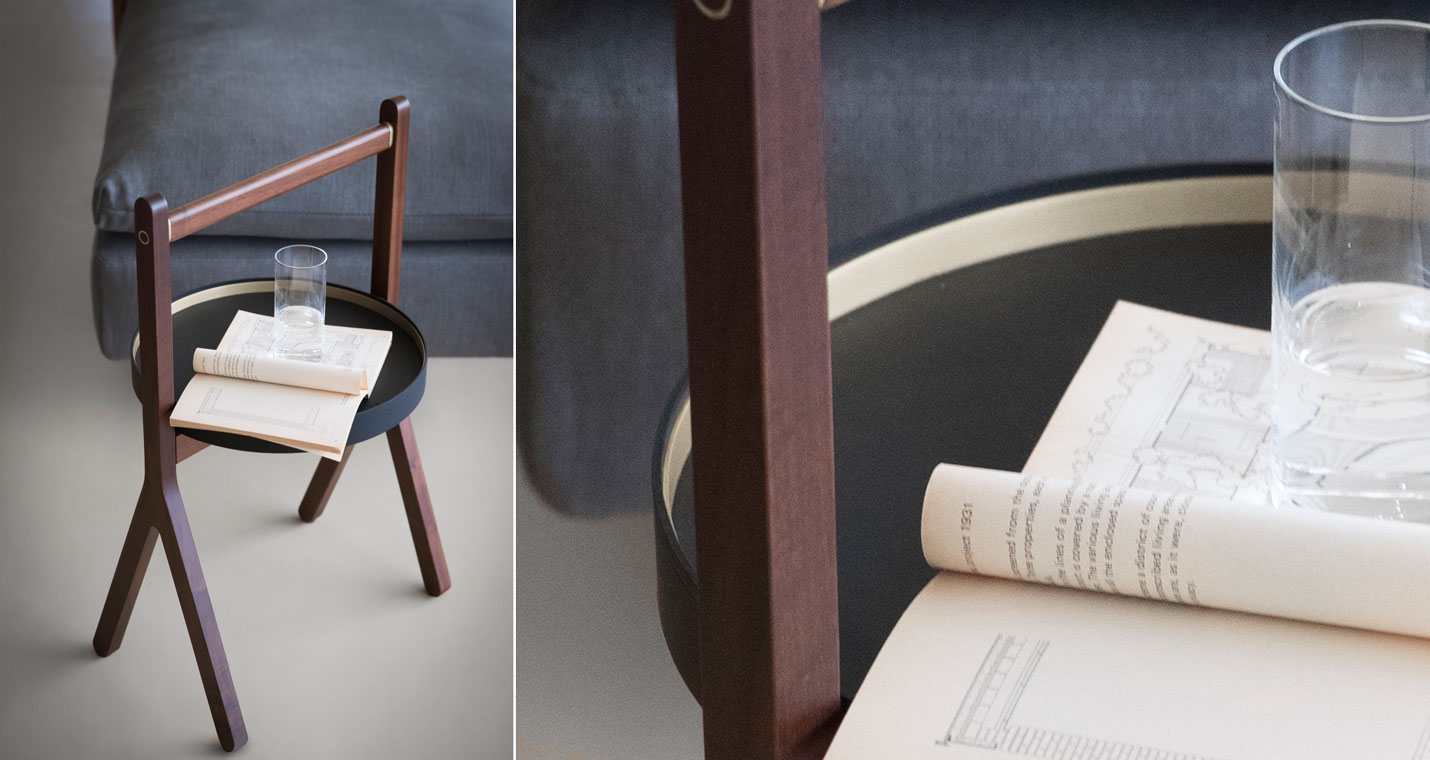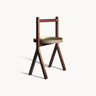 Ren 咖啡桌配有一個托架隔層,由一個有黑胡桃木貼面的樺木膠合板底座和一個包覆鞣制皮革的弧形黃銅框架構成。底部覆蓋一塊 Saddle Extra 鞣制皮革墊。