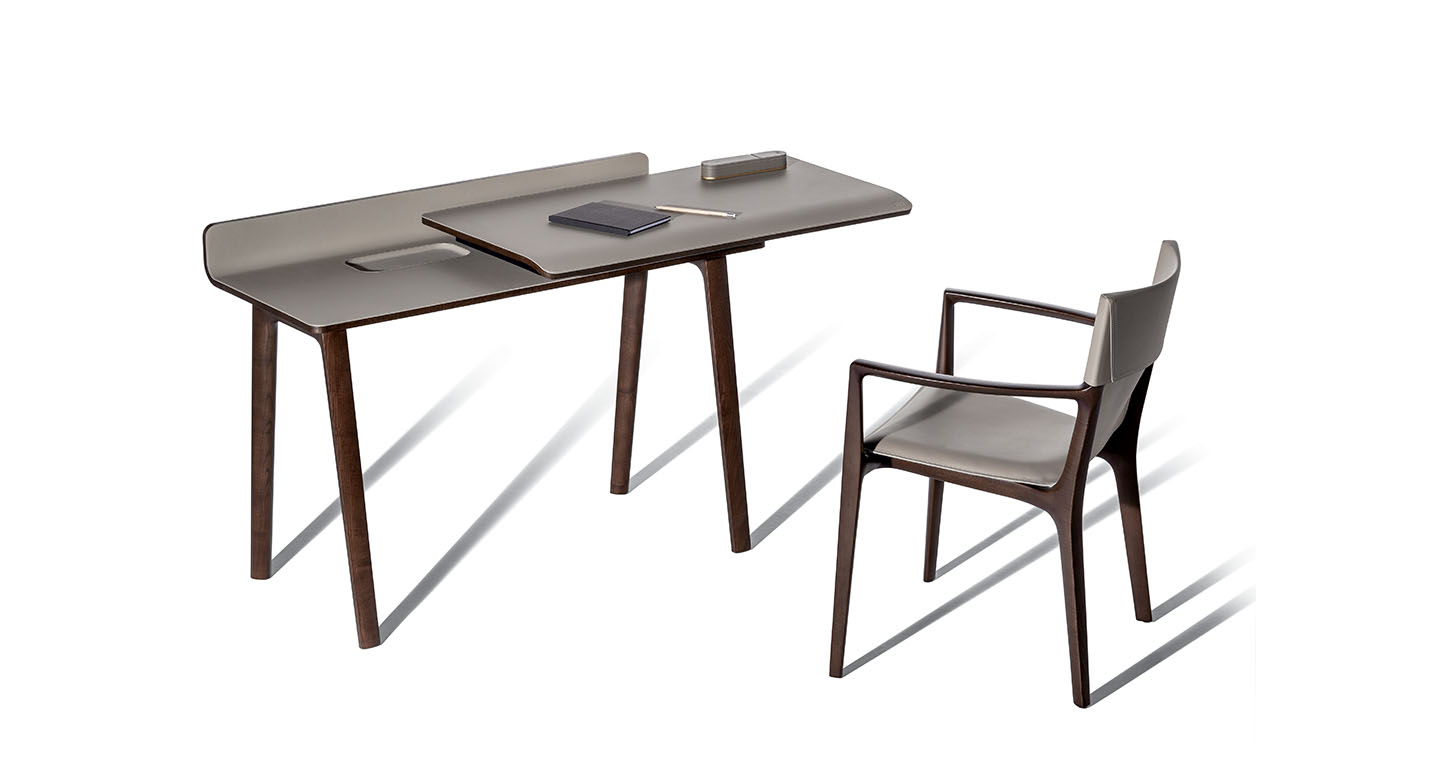 Poltrona Frau的Iren寫字臺包括獨立式版本,其檯面架在畫架式白蠟木實木基座上;另外還有壁掛式,安裝在銷桿上。訂購時,客戶可以選擇向左或向右滑動。