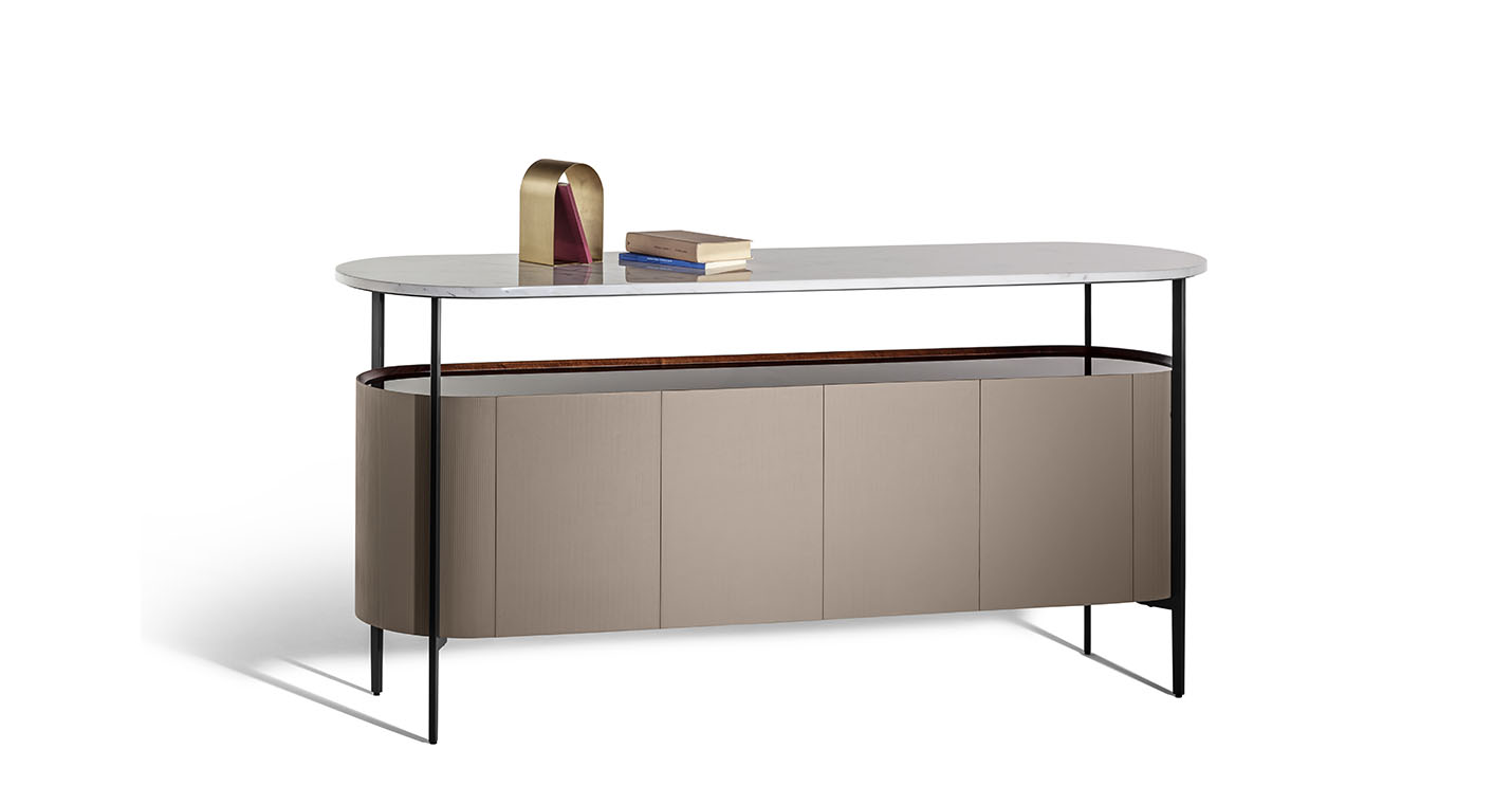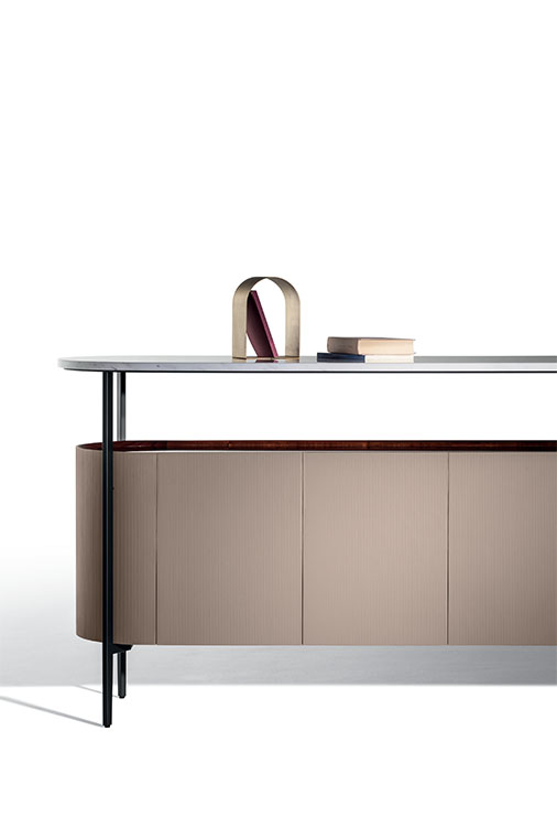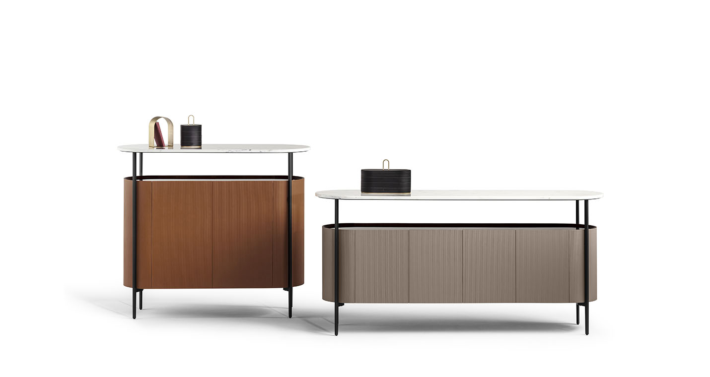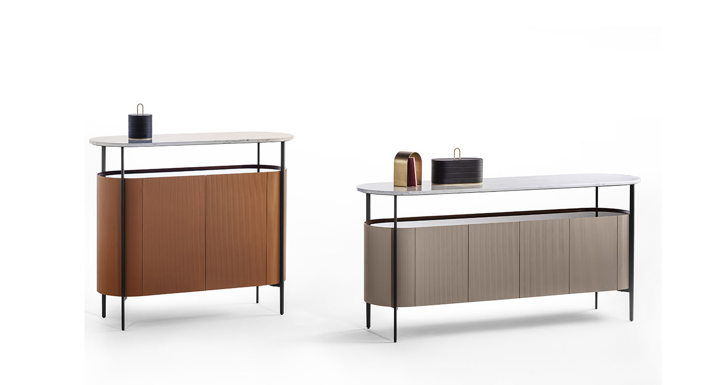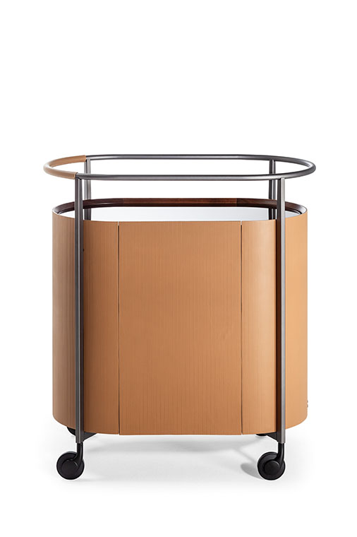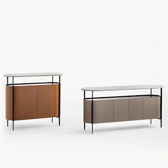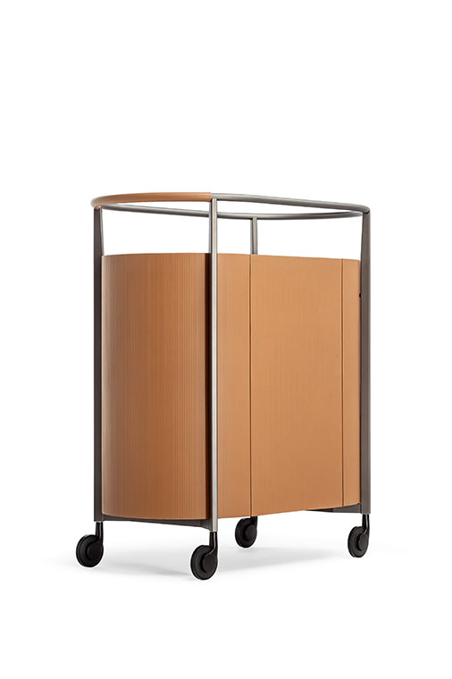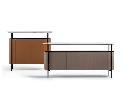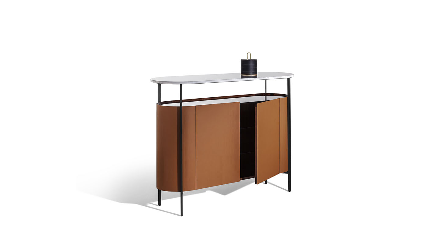 Mi收納柜外表面覆蓋Saddle Extra硬皮,壓印canneté紋理。四種顏色可選:Carbone(木炭)、Cammello(駱駝)、Polvere(灰塵)和Corda(結(jié)繩)。