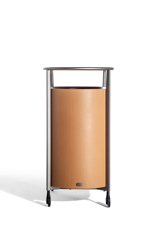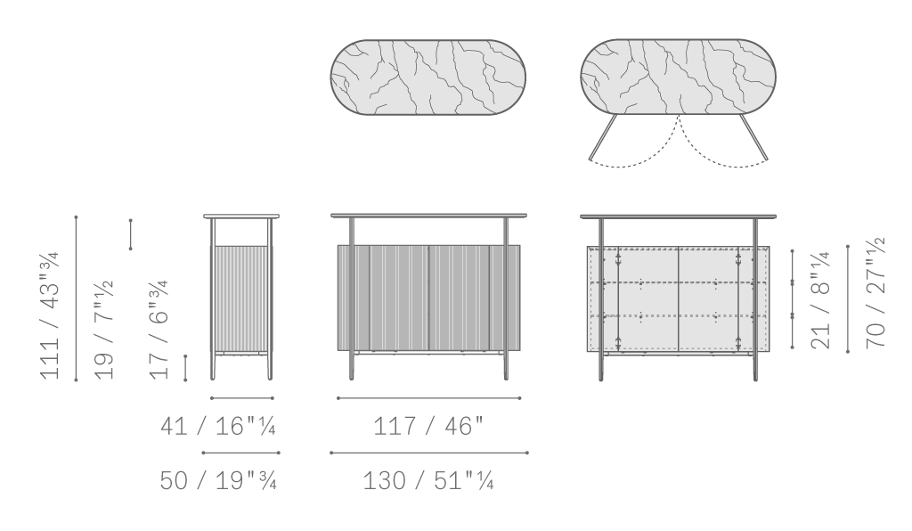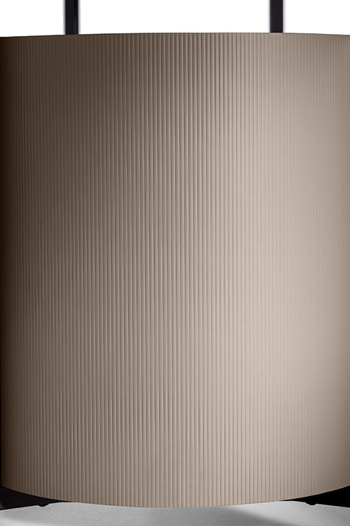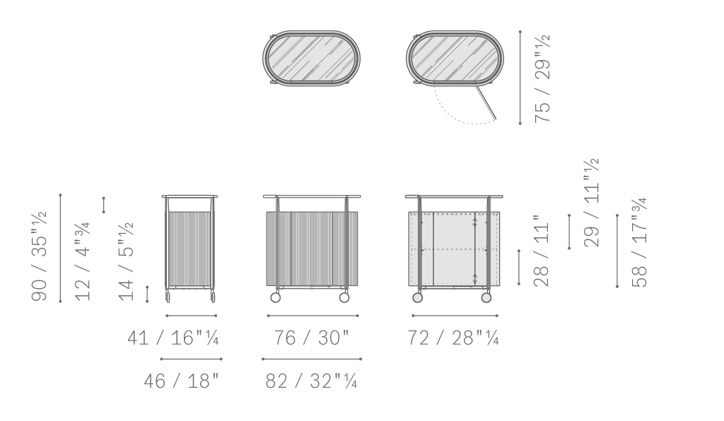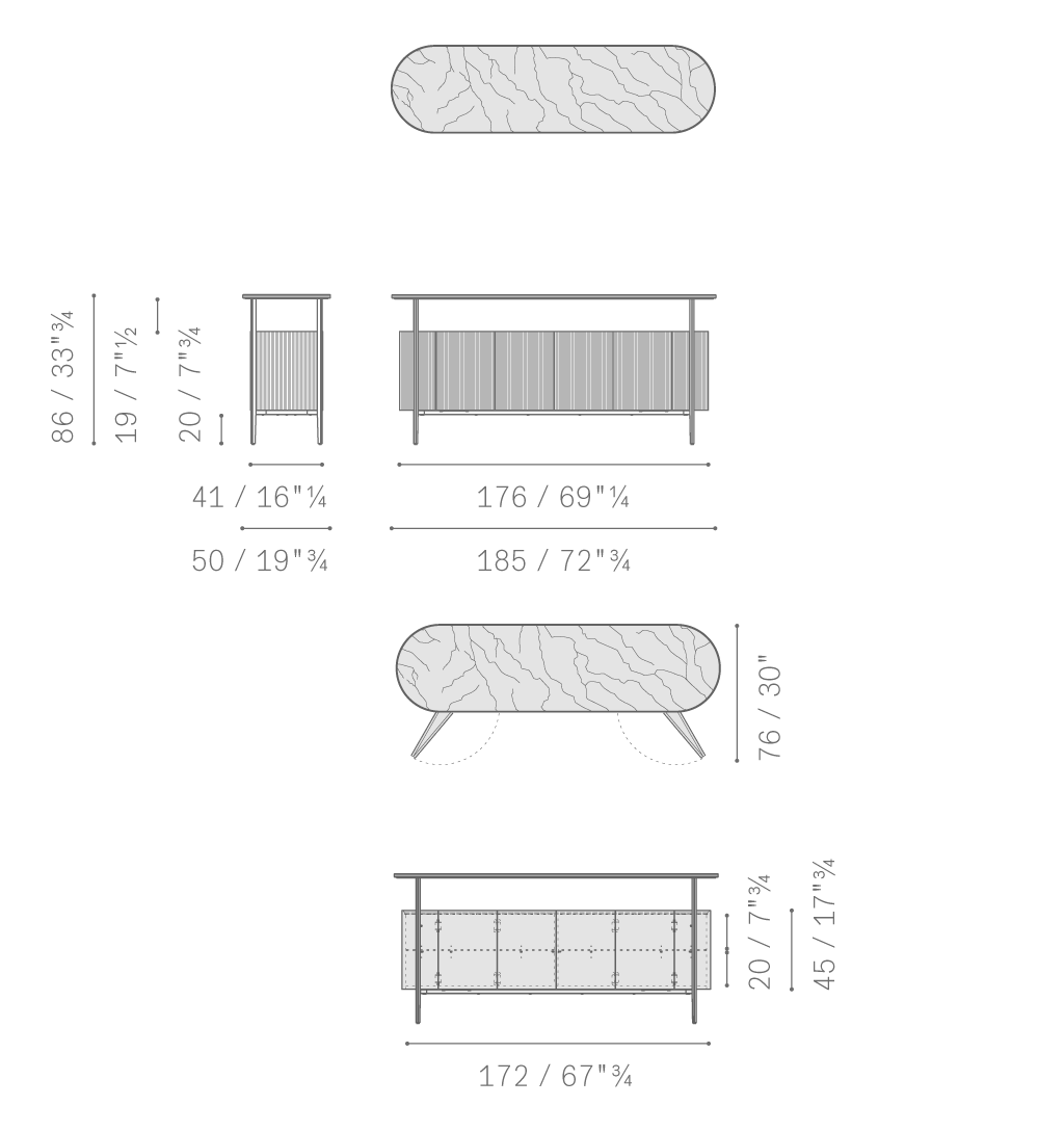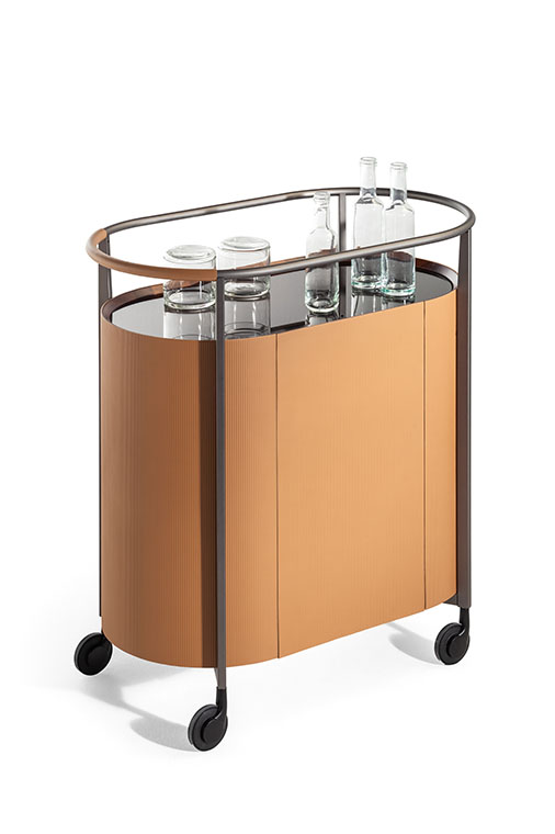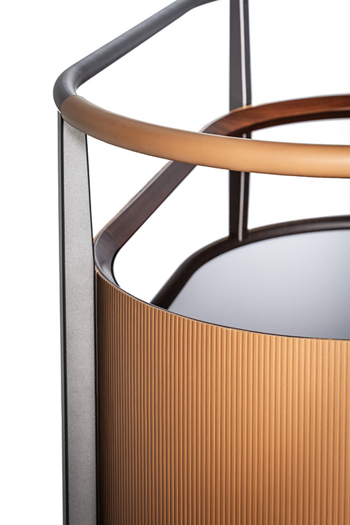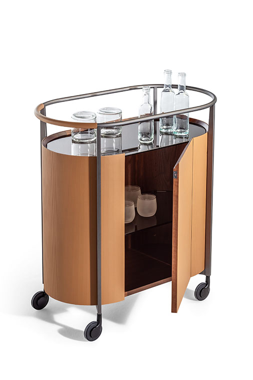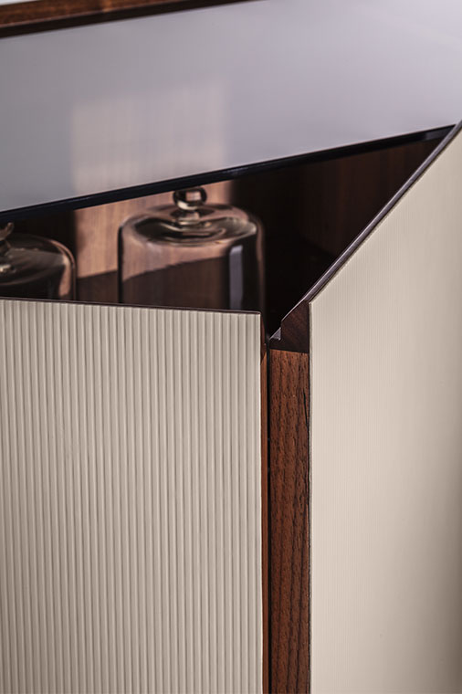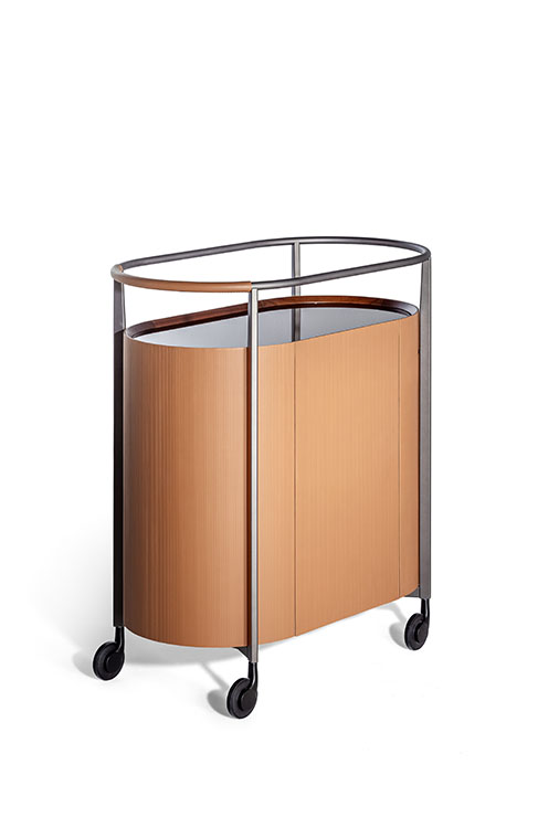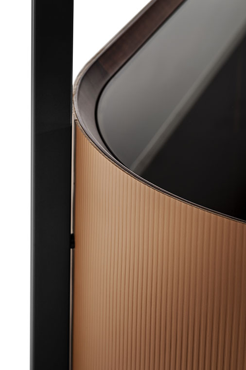 Mi日間收納柜的結(jié)構(gòu)由軋光亮面鋼材表面效果的金屬框架構(gòu)成,框架同時(shí)也作為底座。傢俱兩側(cè)為獨(dú)居特色的楊木複合板弧面板,底板和背板使用樺木膠合板。為了減輕重量,門板採(cǎi)用蜂窩芯材製成。收納柜內(nèi)部和底板均採(cǎi)用黑胡桃木貼面。柜頂和門板上邊框使用黑胡桃木實(shí)木。Mi系列無(wú)論是雙門高斗櫥還是四門矮柜,其內(nèi)部均使用古銅色鋼化玻璃隔層板,此外柜頂上部蓋板也採(cǎi)用古銅色鋼化玻璃,能夠透視柜子內(nèi)部,仿佛一面展示櫥窗。Mi高餐邊柜帶有雙開門。Mi矮餐邊柜則為四門,採(cǎi)用書頁(yè)式系統(tǒng)兩兩開啟。柜門通過(guò)磁力關(guān)閉固定。結(jié)構(gòu)利用可調(diào)支腳架在地面上。Mi小推車框架上裝有四個(gè)塑膠和鋼質(zhì)黑色自轉(zhuǎn)輪。小推車上部框架末端連接著拋光鋼管,勾勒出傢俱的形狀并可用作把手。把手的一側(cè)覆蓋有與小推車的飾面相匹配的Cuoio Saddle Extra硬皮,上面帶有手工縫線。內(nèi)部空間配有鋼化玻璃隔層,可調(diào)整為三個(gè)不同的高度位置。