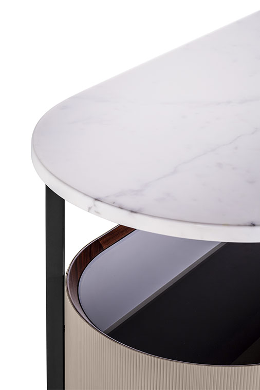 頂面懸置于木制柜體之上,使用卡拉卡塔金色大理石或馬齊納黑大理石製作。兩種頂面均提供拋光表面處理,然后涂上一層透明聚酯漆,提高表面耐受力;或半拋光表面處理,帶來(lái)天然效果。