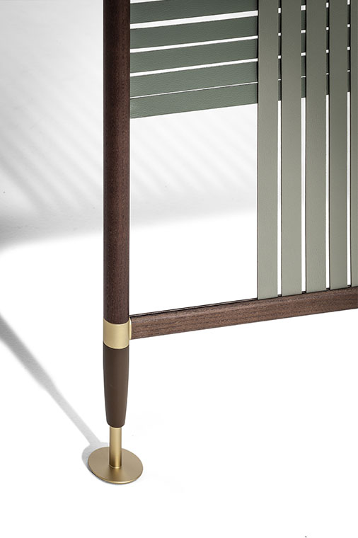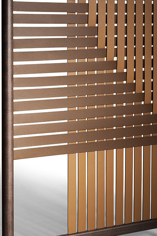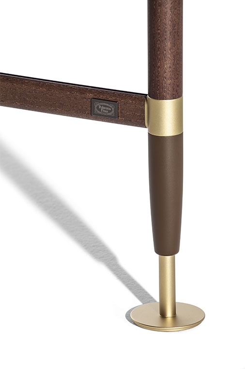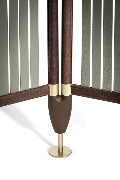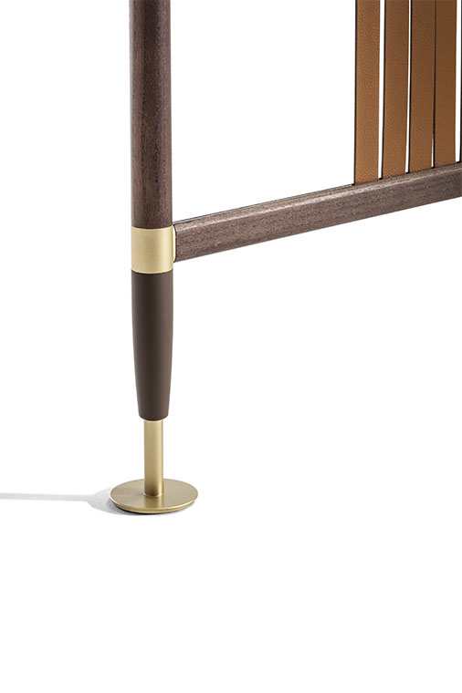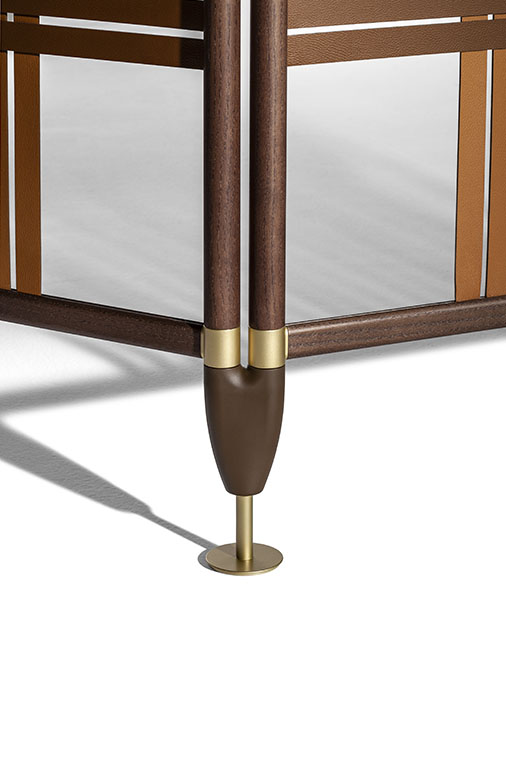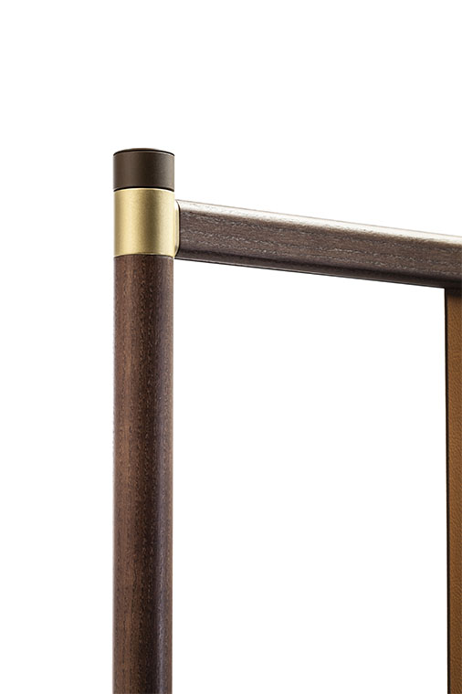 結構採用摩卡色白蠟木表面效果貼面鋁管制成。縱橫管之間的連接採用經(jīng)過啞光黃銅表面處理的金屬元件。下部錐形底腳也採用金屬,表面噴漆。結構支撐在啞光黃銅飾面金屬底腳上。