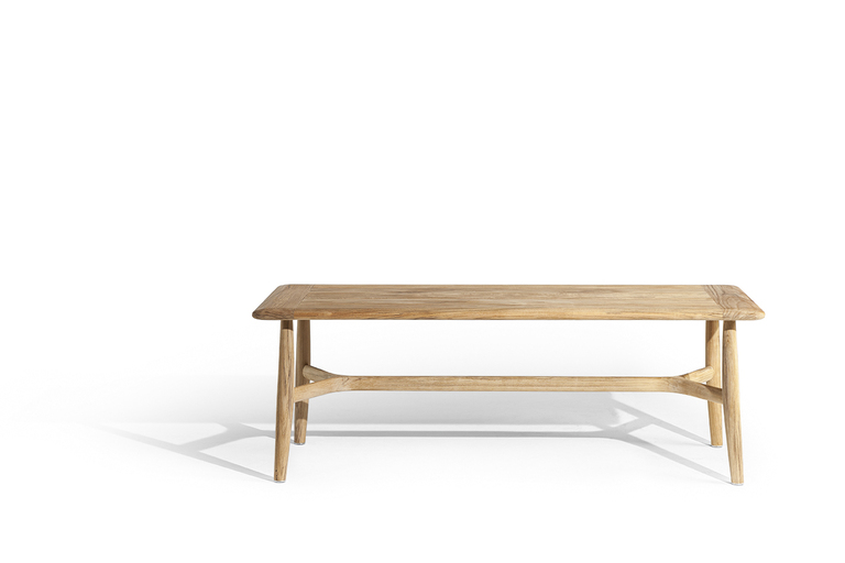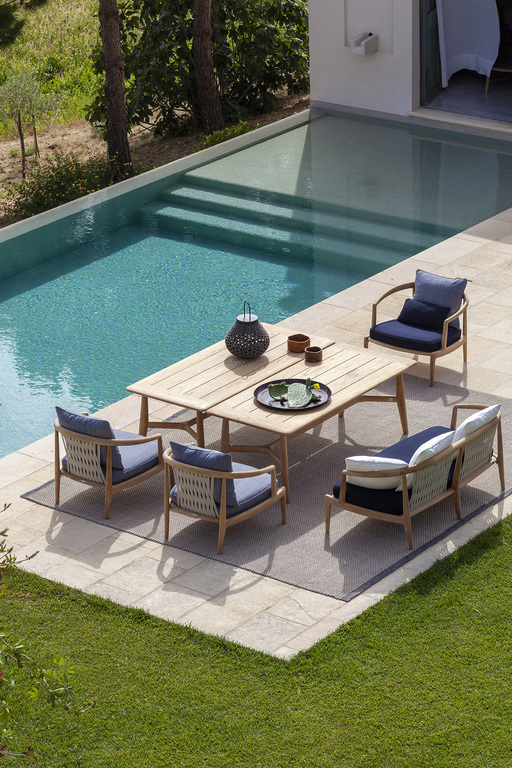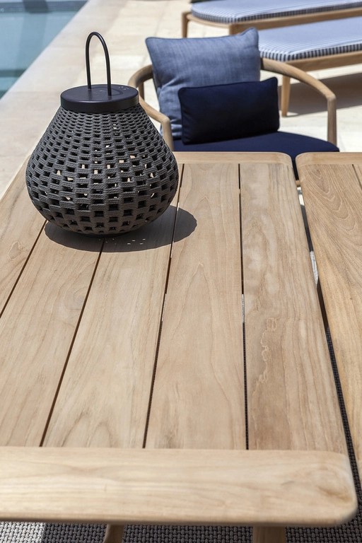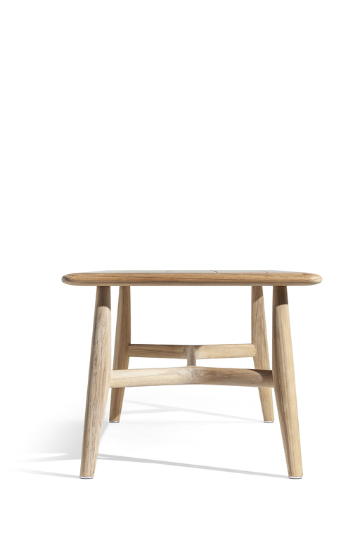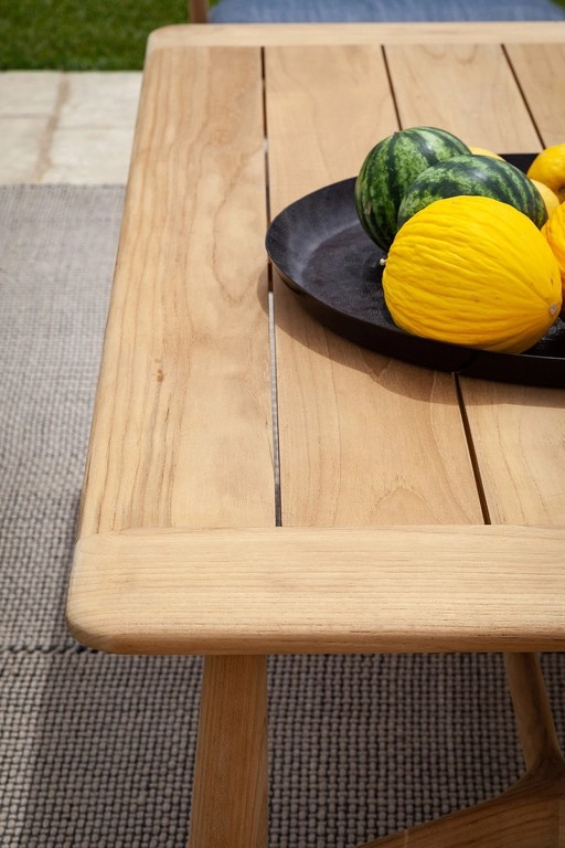 Designed for a more informal dining experience, the outdoor table is generously sized and low in height to match the ergonomic seating of the two-seater sofa and armchairs from The Secret Garden outdoor furniture collection, designed by Roberto Lazzeroni. The frame and top are made of solid teak wood in a natural finish. The top has a staved pattern that reflects a typical motif of older nautical eras. Part of the range offered by Poltrona Frau Boundless Living Outdoor Collections.