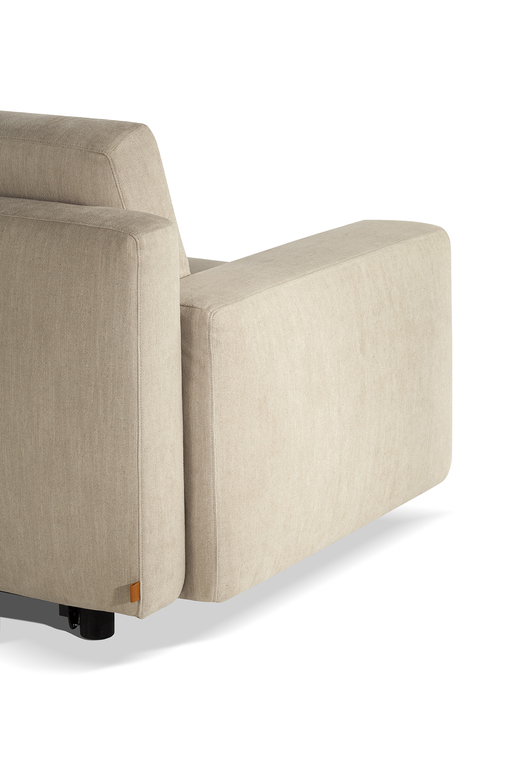 The sofa-bed is integrated within the large modular sofa system that makes simplicity and minimalism its strong point. The technical opening mechanism is not visible because it is completely hidden in the structure, making the sofa bed visually identical to the large two-seater version.
