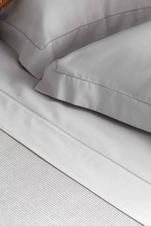 The best cotton satin for an unrivalled feeling of softness and silkiness. The Riomaggiore set of coordinated night accessories is made of 300-thread-count cotton, a perfect balance between dense weave and the lightness of the fabric. The prevalence of warp in the weave and the finishing with calendering give it a refined touch and a high lustre, a symbol of quality and luxury. In optical white, ivory and oyster, the top double-bed sheet features a 10 cm bracelet finished with a jour hem; detail taken from the pair of pillowcases, featuring four 6-cm ruffles finished with the same continuous hem.