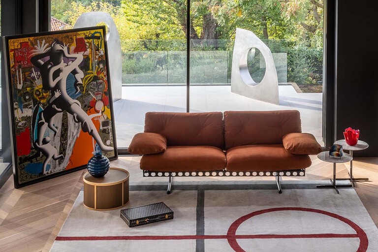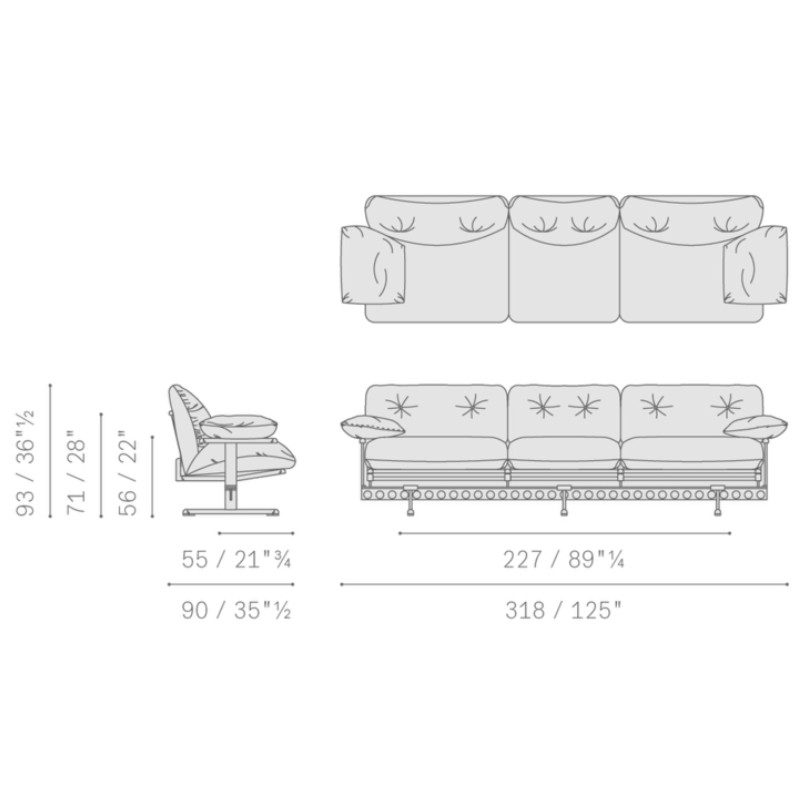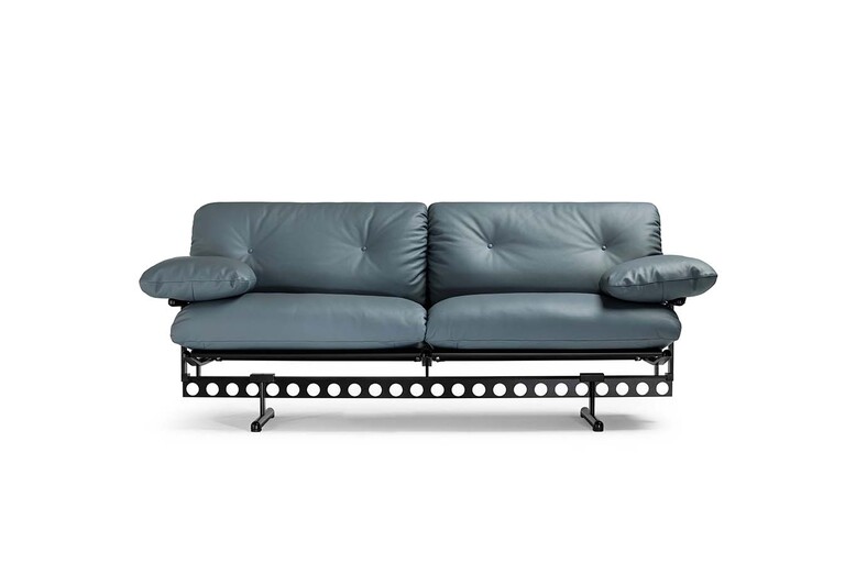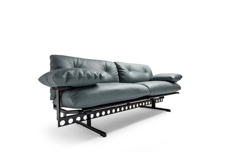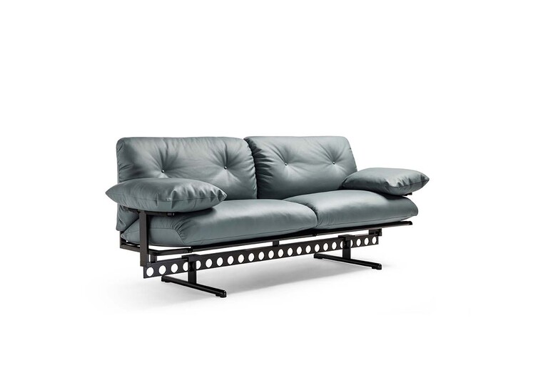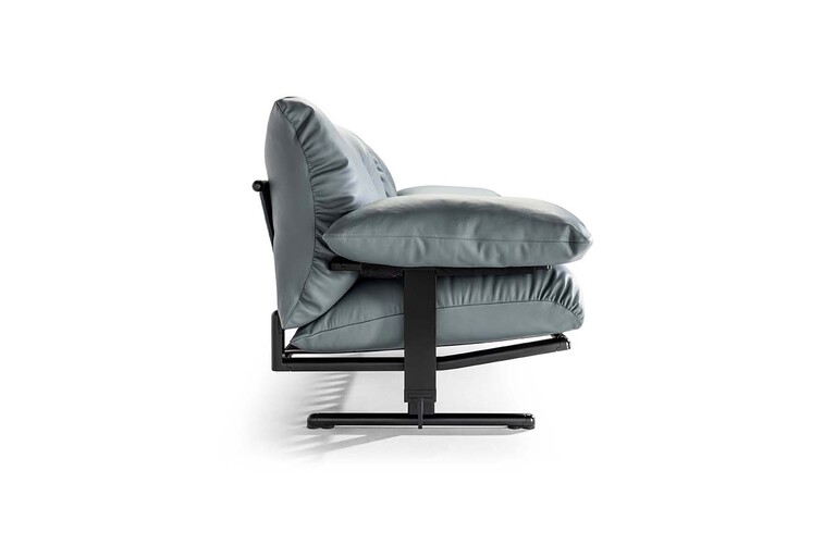 The steel frame is airy and slender. The “T”-shaped beam is separated from the crossbars that support the seat in such a way that the padded part of the sofa appears to float in the air. The load-bearing beam, free of joints, is connected by aluminium profiles in a sophisticated play on interconnections that are clearly visible from the side. The high-tech aesthetic of the metal parts, all of which are finished with matt black epoxy powder paint, contrasts with the warmth and softness of the cushions.