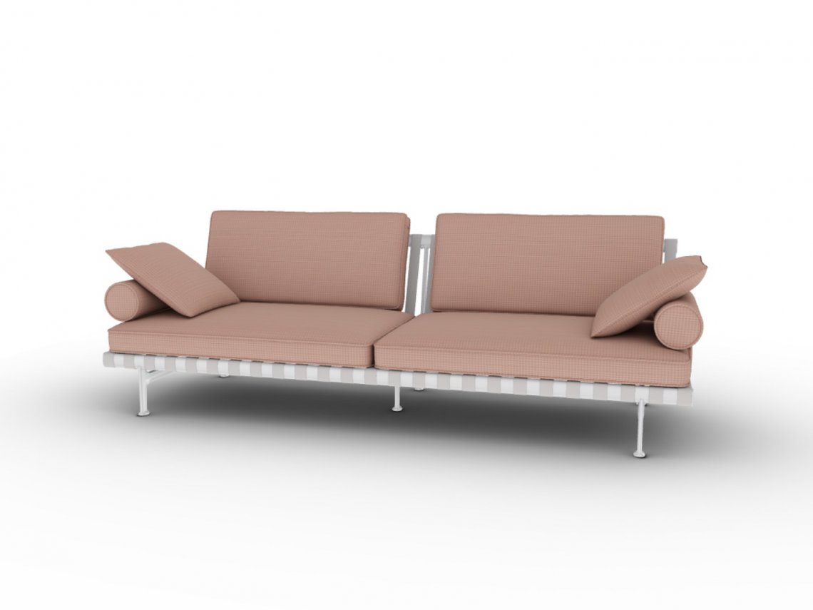 Generously sized, it features a simple design that interprets two archetypes of outdoor furniture: metal and woven belts. The polypropylene fibre elastic belts punctuate the surface of the seat and backrest with full and empty spaces, creating an image of lightness and transparency. That lightness is also emphasised by the cast aluminium support feet, which make the sofa appear as thought it is suspended off the ground. The supporting structure, in extruded aluminium, is made up of three longitudinal beams with an oval section that form an "L", wrapped in the motif created by the belts. The cushions are made up of large "mattresses", emphasised by pronounced piping that draws their silhouette. They are placed directly on the woven structure, without concealing it. The padding is double-density draining polyurethane foam, designed especially for outdoor furnishings.