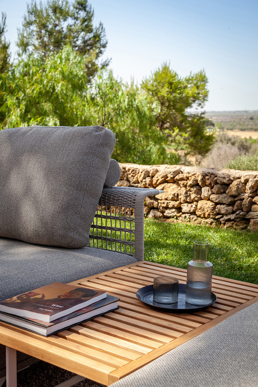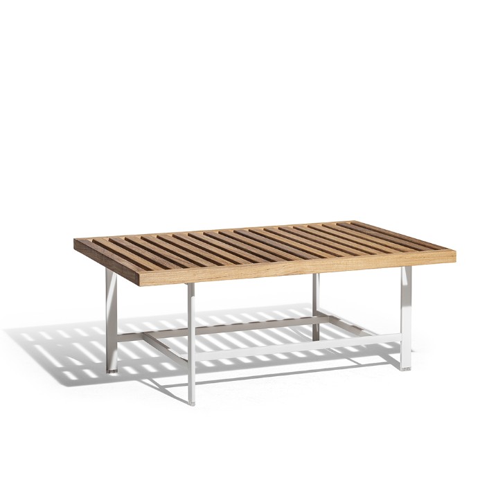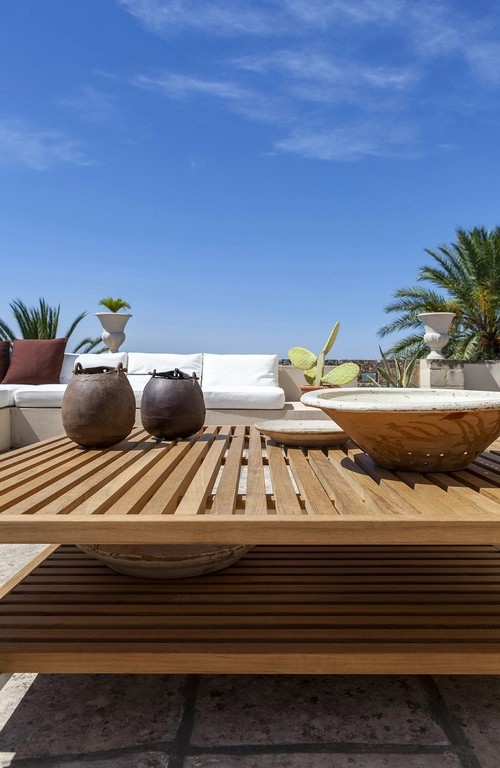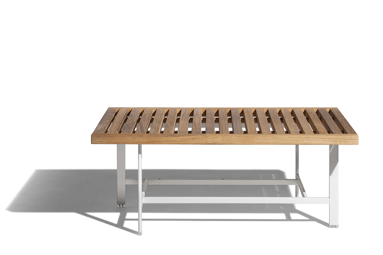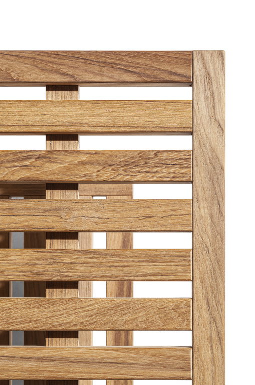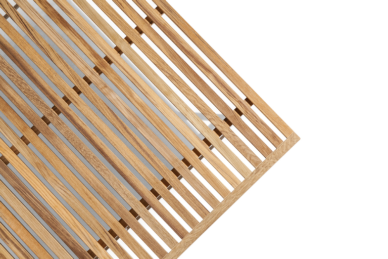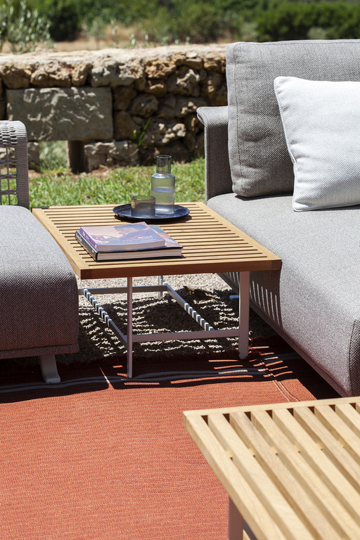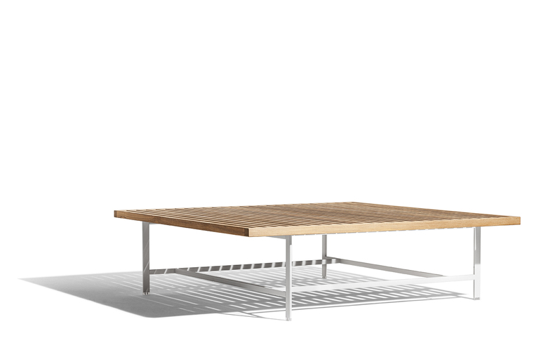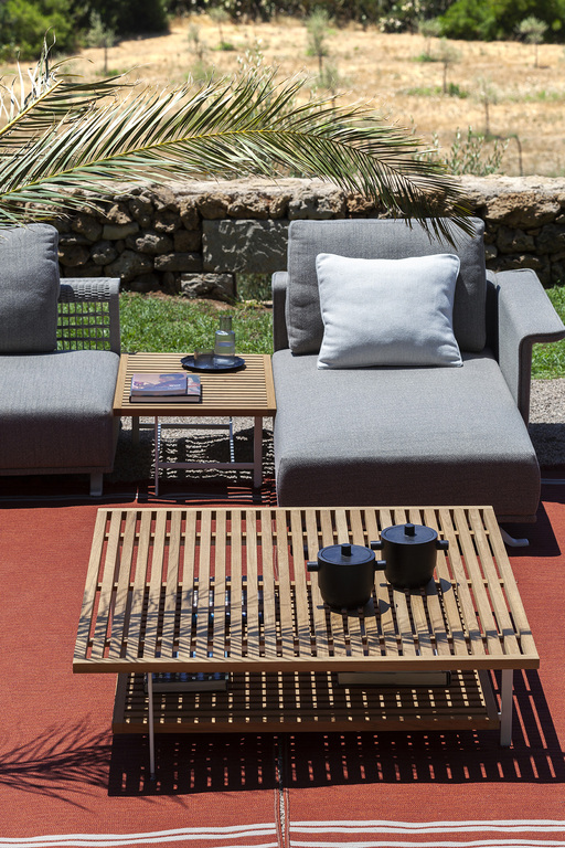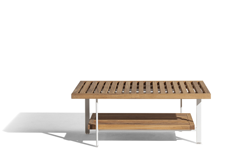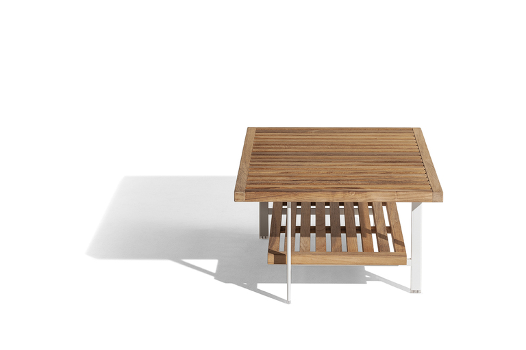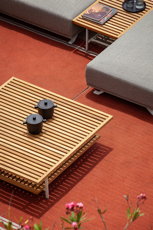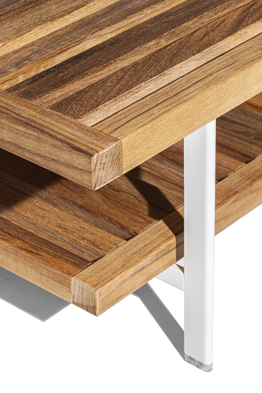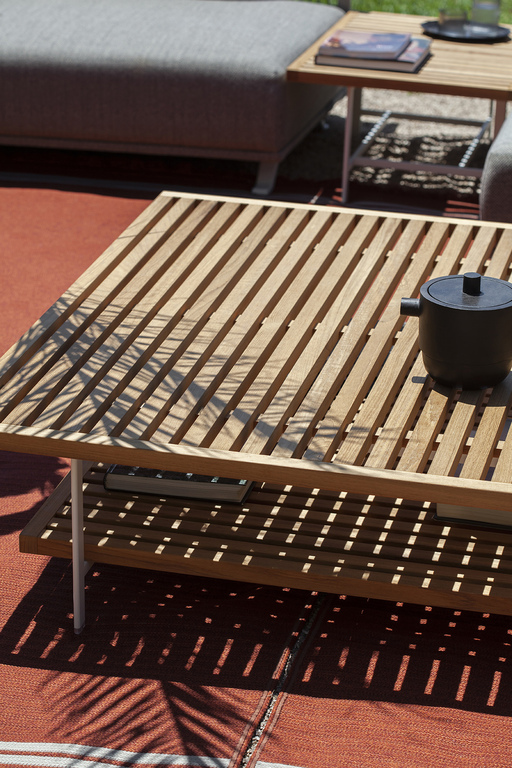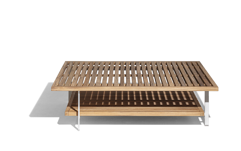 Design with clean-cut lines. The outdoor side tables, made of solid teak wood with a stainless steel base, form part of the Solaria outdoor collection, designed by Ludovica + Roberto Palomba. They come in square and rectangular versions, with single or double tops. The staved workmanship of the tops is in keeping with Solaria's typical themes of interweaving and transparency. On the double-top table, the alternating direction of the two tops evokes the "carabottino" (grating) typical of the nautical industry. Completing the collection are the Poltrona Frau Boundless Living Outdoor Collections for furnishing the lounge area of gardens, terraces, patios, poolside areas as well as nautical decks.