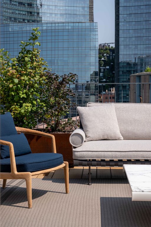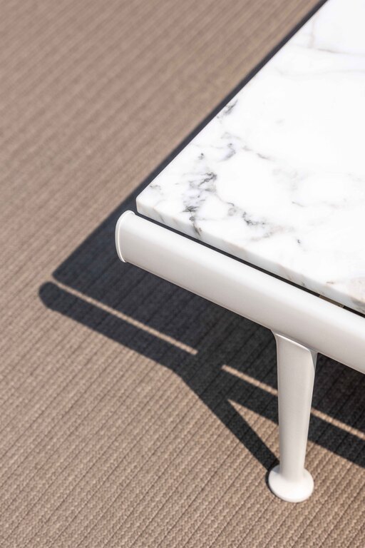 Souvenir d'Italie is made of only two materials: metal and marble. The top is made of refined Arabescato Marble with a natural finish, allowing the uniqueness of each quarry block to highlight the interplay of the dark grey veins. The supporting structure is made of extruded aluminium lacquered in Gesso and Basalto shades, which warm the material, evoking shades closer to nature, while the feet of the table are made of cast aluminium, with a finely embossed powder coating.