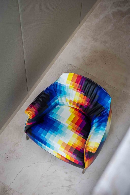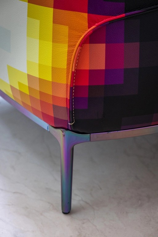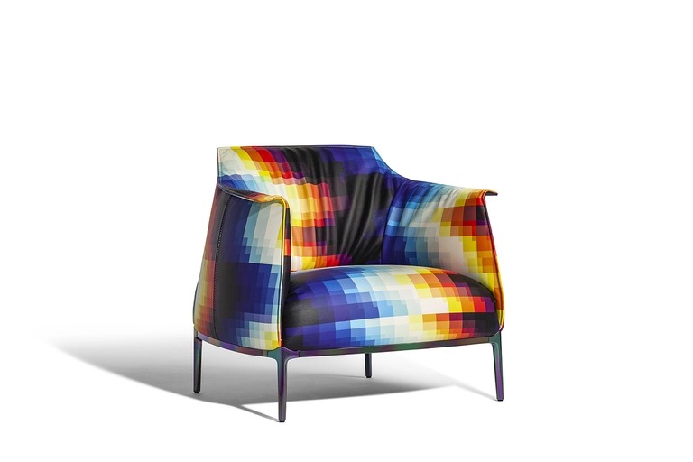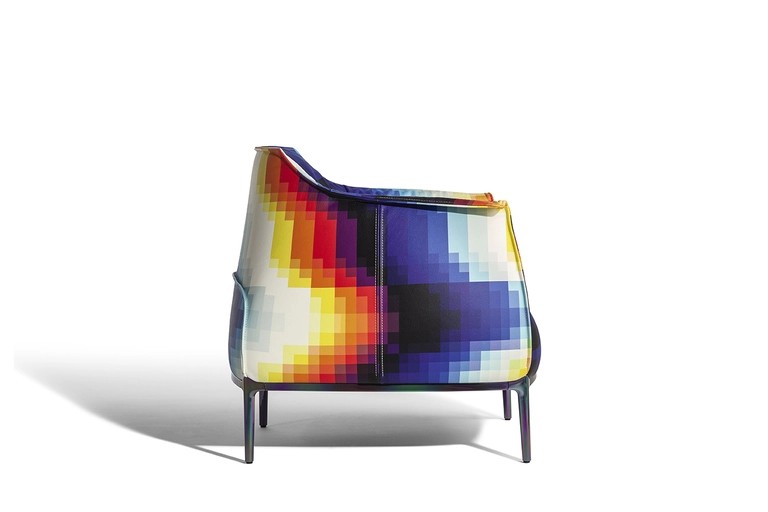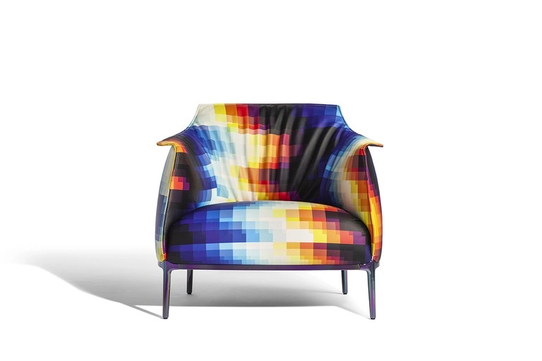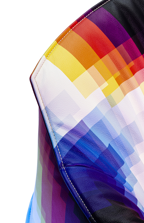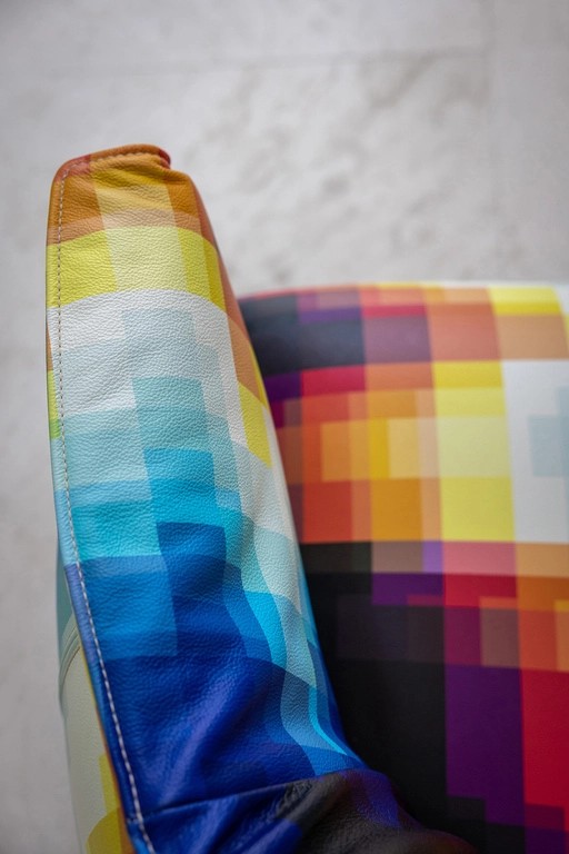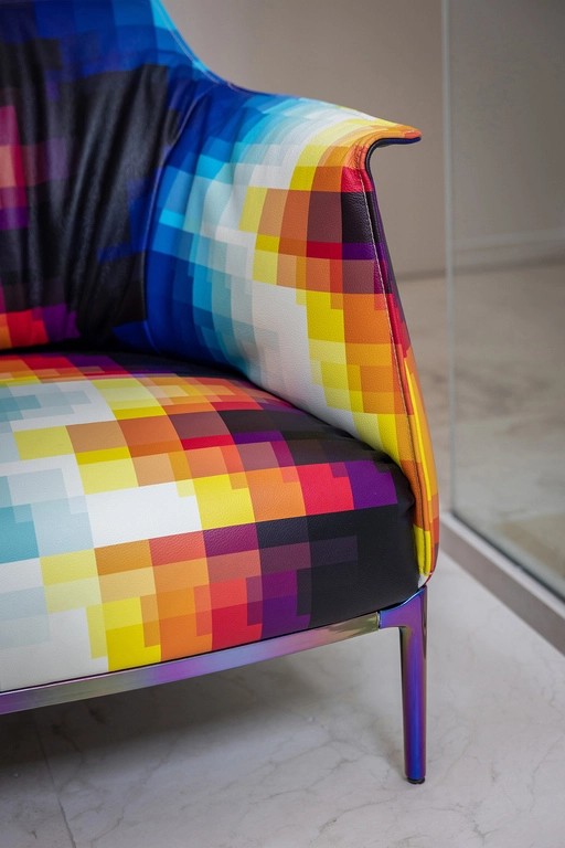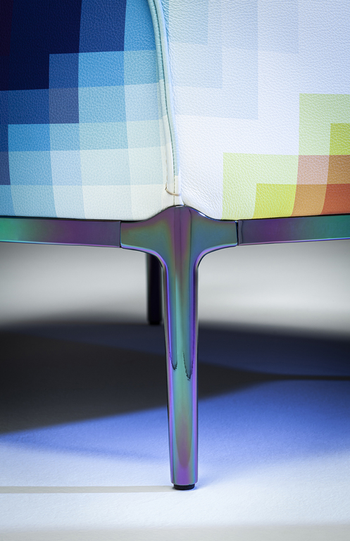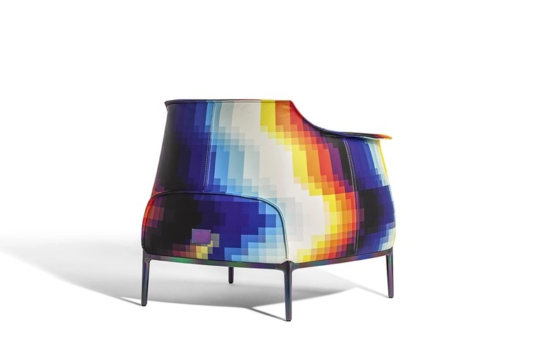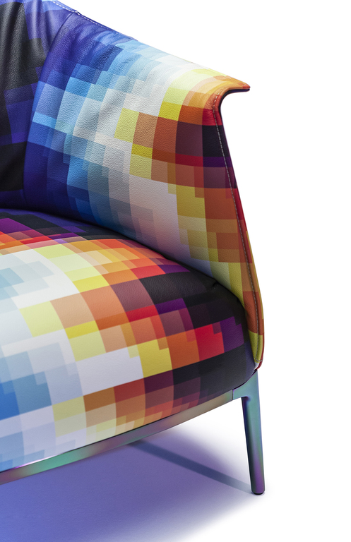Archibald, designed by Jean-Marie Massaud, is a wide and deep armchair with a steel structure, padded with moulded polyurethane foam and polyester wadding for greater comfort. It is distinguished by the pleasantly textured leather upholstery and the folded armrests that resemble a shirt collar. Thanks to a process of digital printing on the leather, usually reserved for small luxury leather goods, Felipe Pantone's artwork gives the upholstery a nuanced palette of reds, oranges, yellows, whites and blues reminiscent of the hot and cold temperatures of a heat map. The upholstery is in Pelle Frau ColorSphere Impact Less, the innovative leather tanned with sustainable components and without the use of chrome for a reduced environmental impact.