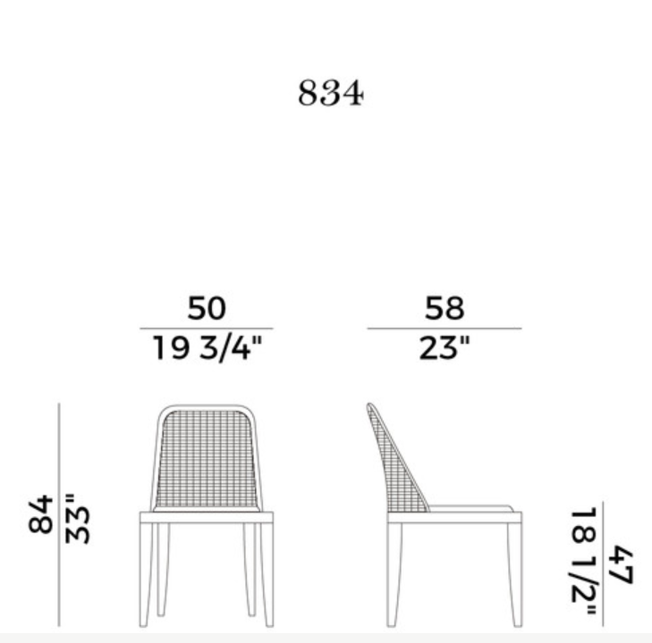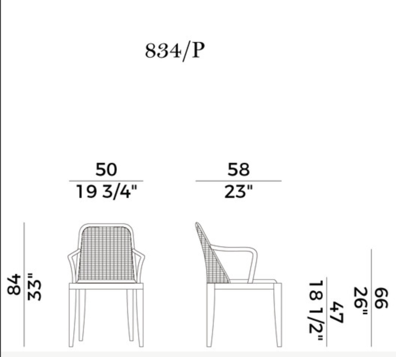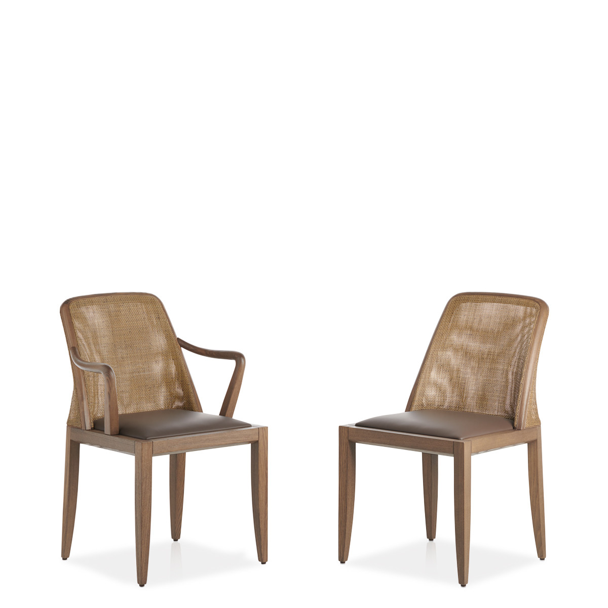 The seat is padded with fire-retardant polyurethane foam, covered in the fabrics and leathers as per collection, and the backrest is in cane.