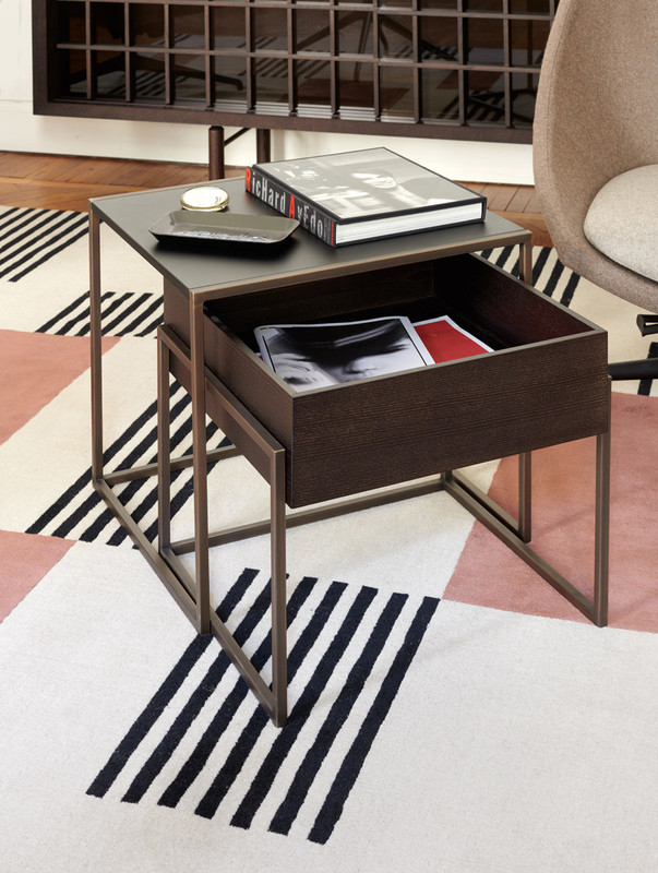 Pocket was born from the idea of creating a coffee table in the name of multifunctionality. Its structure is composed of two interlocking coffee tables of different heights: the highest one with metal base and black lacquered top, the lowest with the same metal base and container top in ash wood or Canaletto walnut that can be used as a drawer or top.
