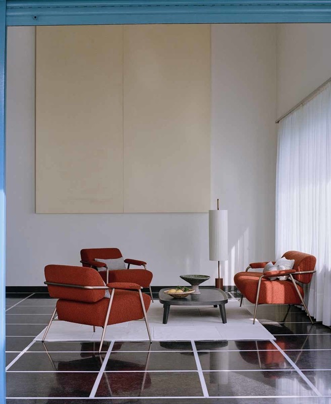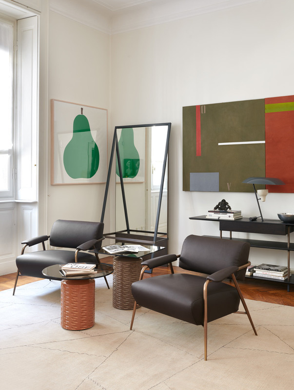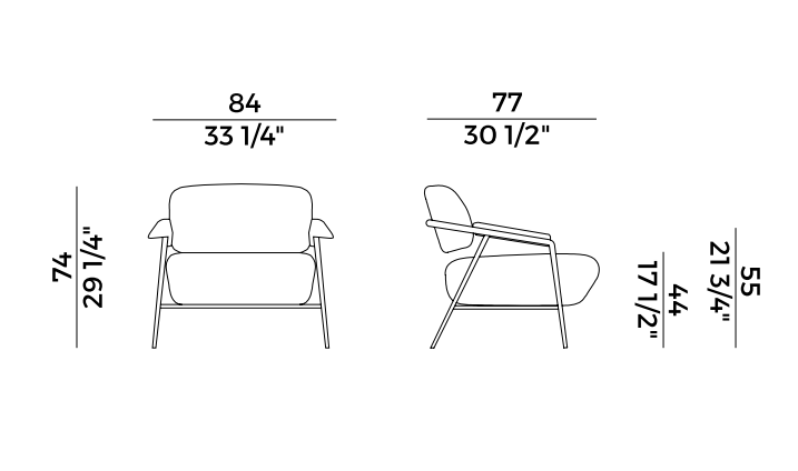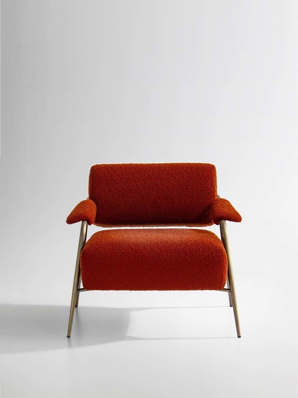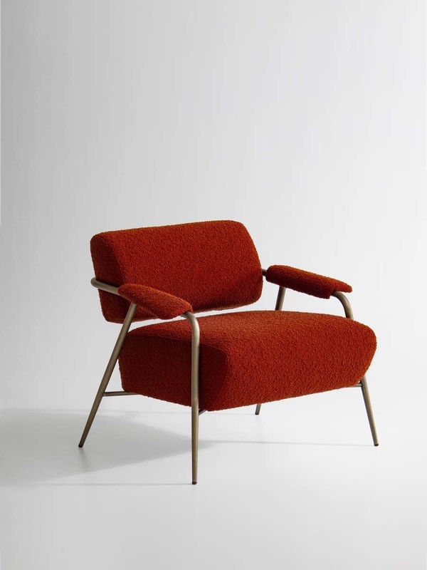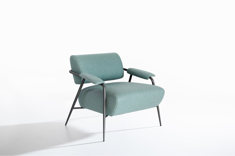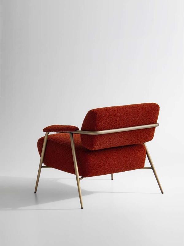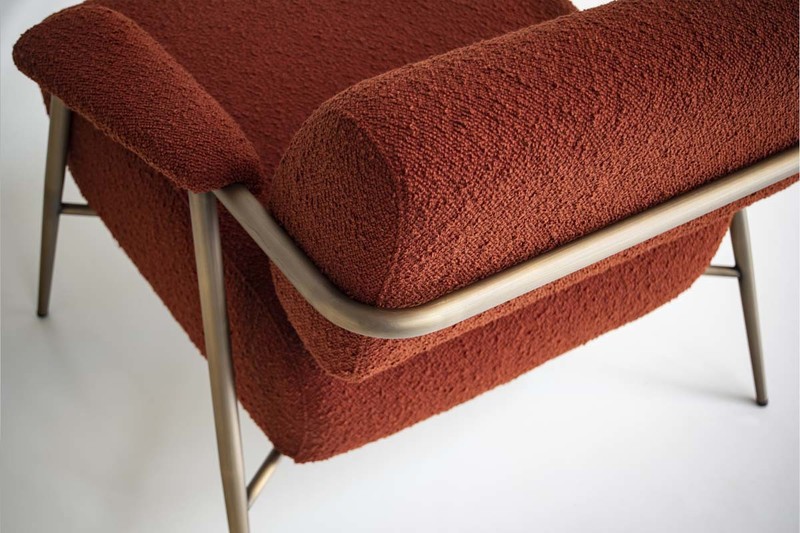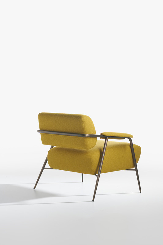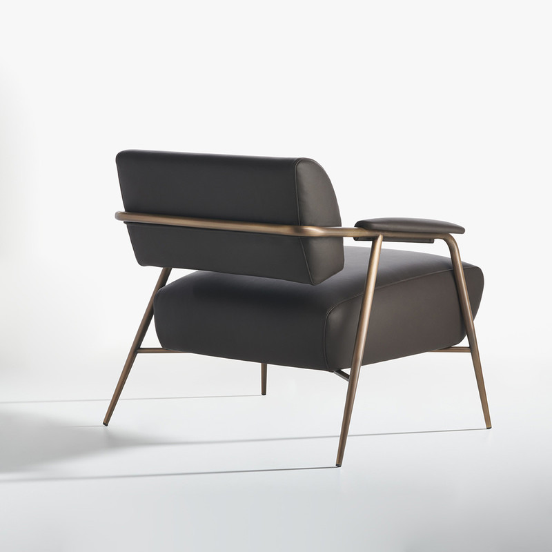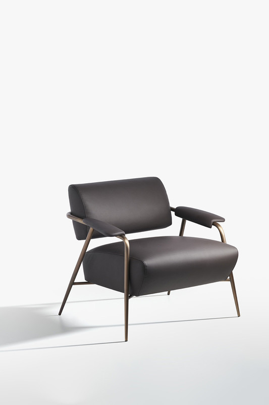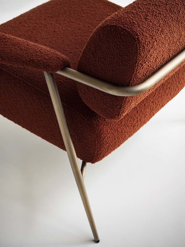 Stay armchair has an essential structure in metal rod, in bronzed brass or anthracite grey finish, which embraces the backrest and seat: the two elements, functionally and visually released from one another, seem to float inside it giving a light levity to the project.