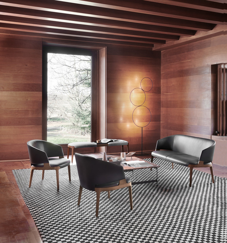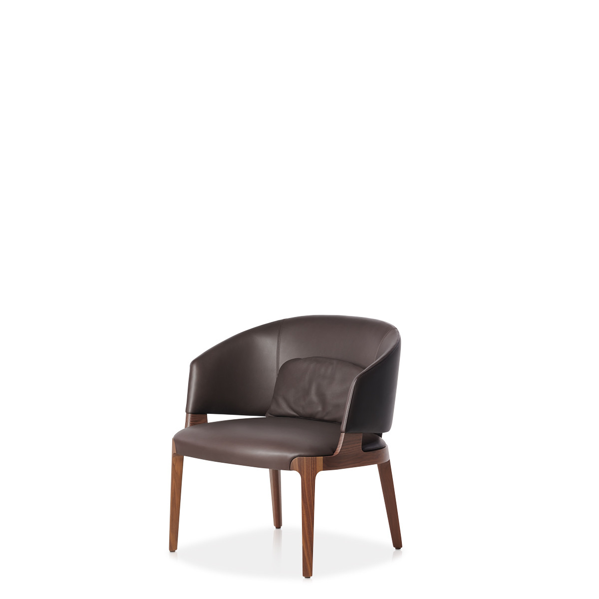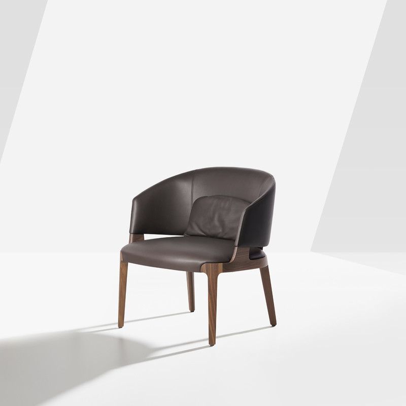 Swivel tub chair with seat and backrest padded in fire retardant polyurethane foam. Seat details in solid ash wood or Canaletto walnut and four-star swivel base in embossed black painted metal. Finishes and coverings as per collection.