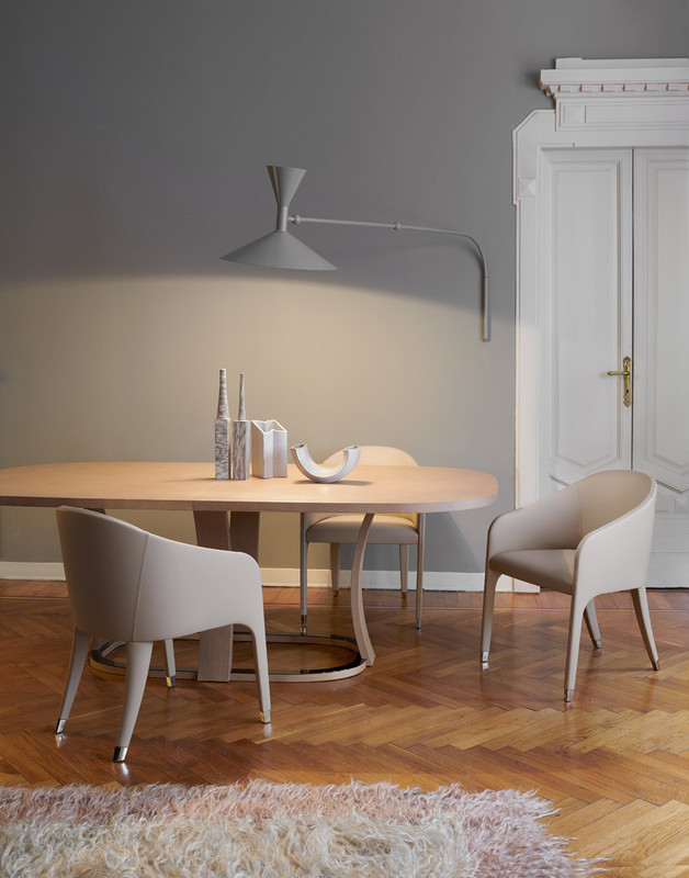 Grace is a table with oval top with central extension and brushed ash structure, in the finishes as per collection, with ruthenium metal protection ring.