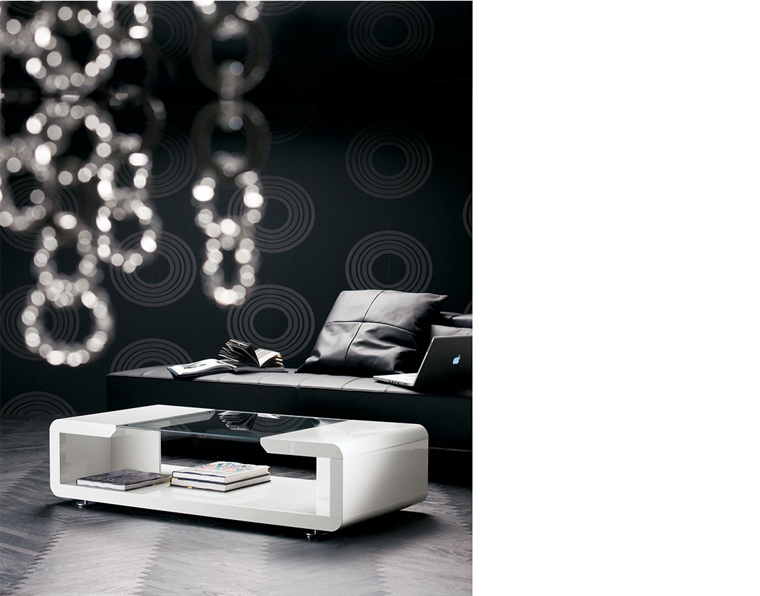Tavolino con struttura placcata frassino o in fibra di legno laccata. Piano superiore in vetro naturale. Particolari in metallo. Finiture disponibili: WG wengé, NC noce, TB tabacco, laccato opaco poro chiuso, ( L1 bianco, L19 madreperla, L3 cappuccino, L5 grigio fumo, L2 nero, L4 rosso, L40 beige microgoffrato, L41 ecrù microgoffrato, L42 fango microgoffrato ), laccato brillante ( L6 bianco, L9 madreperla, L10 cappuccino, L11 grigio fumo, L8 nero, L7 rosso ).