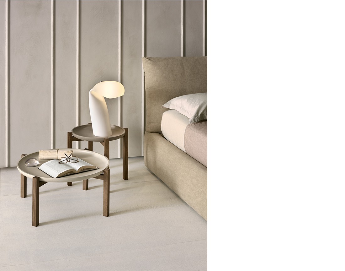 Tavolino con struttura e piano/vassoio in massello di frassino. Finiture disponibili: FN frassino naturale, WG wengé, NC noce, TB tabacco, laccato opaco poro aperto ( L21 bianco, L29 madreperla, L23 cappuccino, L25 grigio fumo, L22 nero, L24 rosso ).
