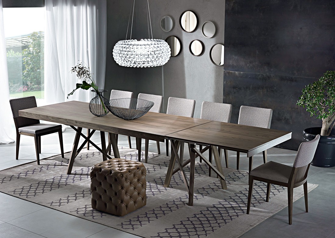 Zeus è un tavolo che ha in sé passato e presente, perchè ricorda gli antichi piani da lavoro delle botteghe artigiane, ripensati in chiave moderna. Un oggetto che è allo stesso tempo semplice e complesso, discreto e sofisticato, bello e funzionale. Le gambe sono sorrette da assi che assicurano stabilità e solidità, rendendo la struttura di questo mobile assolutamente particolare e adatta a vestire qualsiasi ambiente, grazie al calore del legno massello in noce canaletto mescolato sapientemente ad un design dal forte allure contemporaneo.