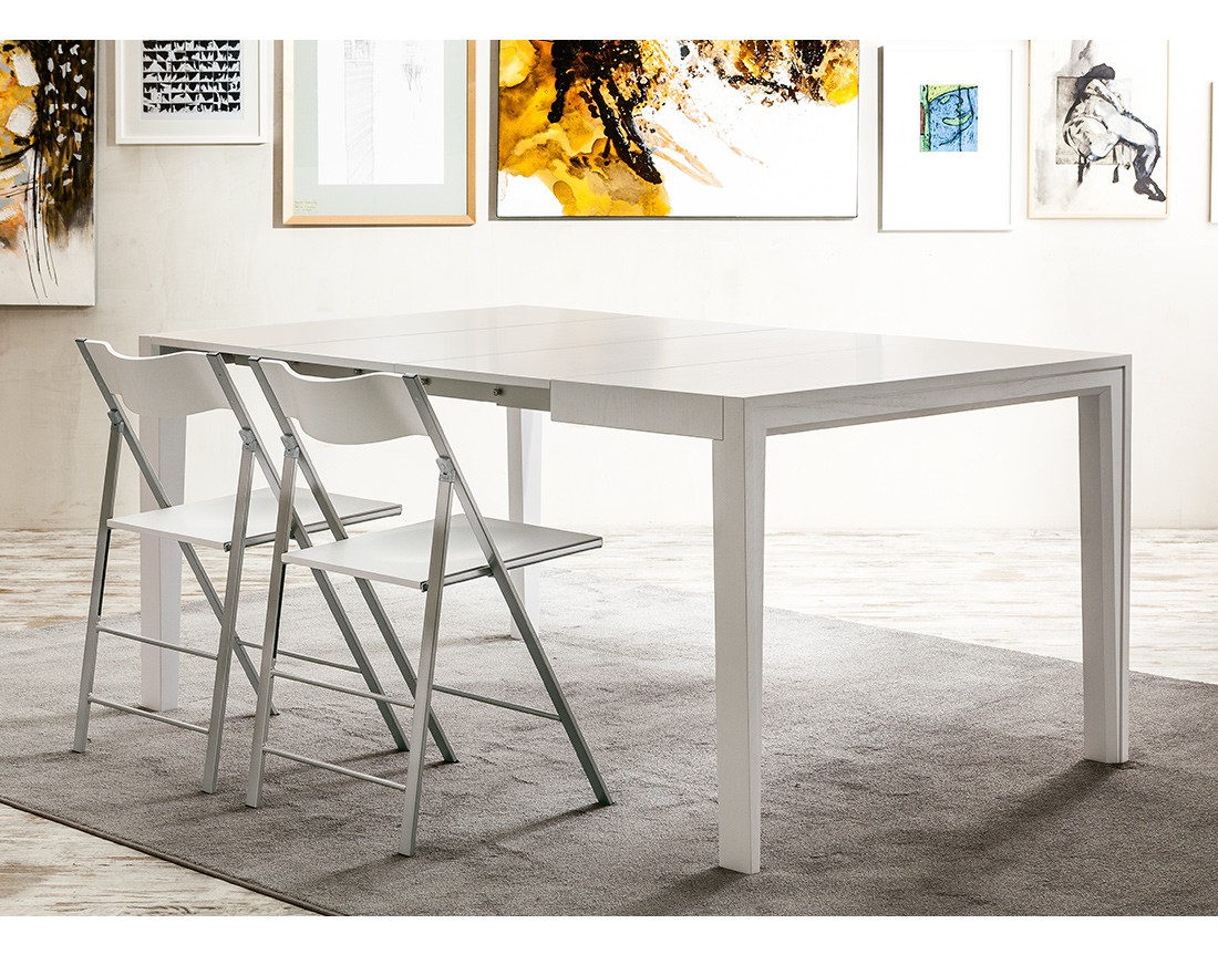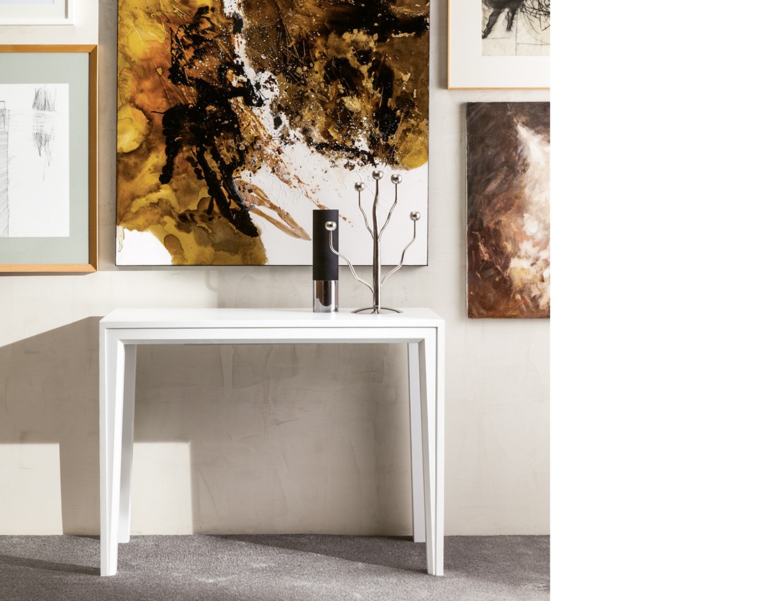 Tavolo-consolle allungabile con struttura in massello di frassino e piani placcati. Dotato di 3 o 5 prolunghe per ottenere misure diverse. Meccanismo telescopico in alluminio. La versione 5423.2 è dotata di sostegno centrale. Finiture disponibili: WG wengé, NC noce, TB tabacco, laccato opaco poro aperto ( L21 bianco, L29 madreperla, L23 cappuccino, L25 grigio fumo, L22 nero, L24 rosso ).