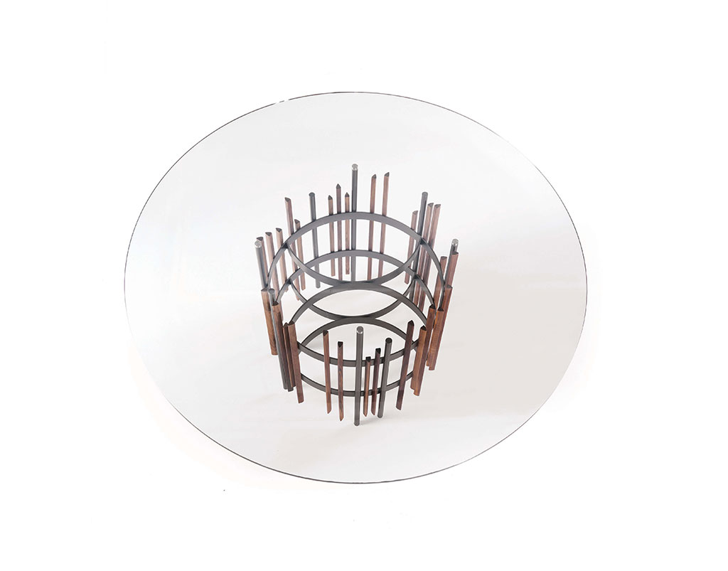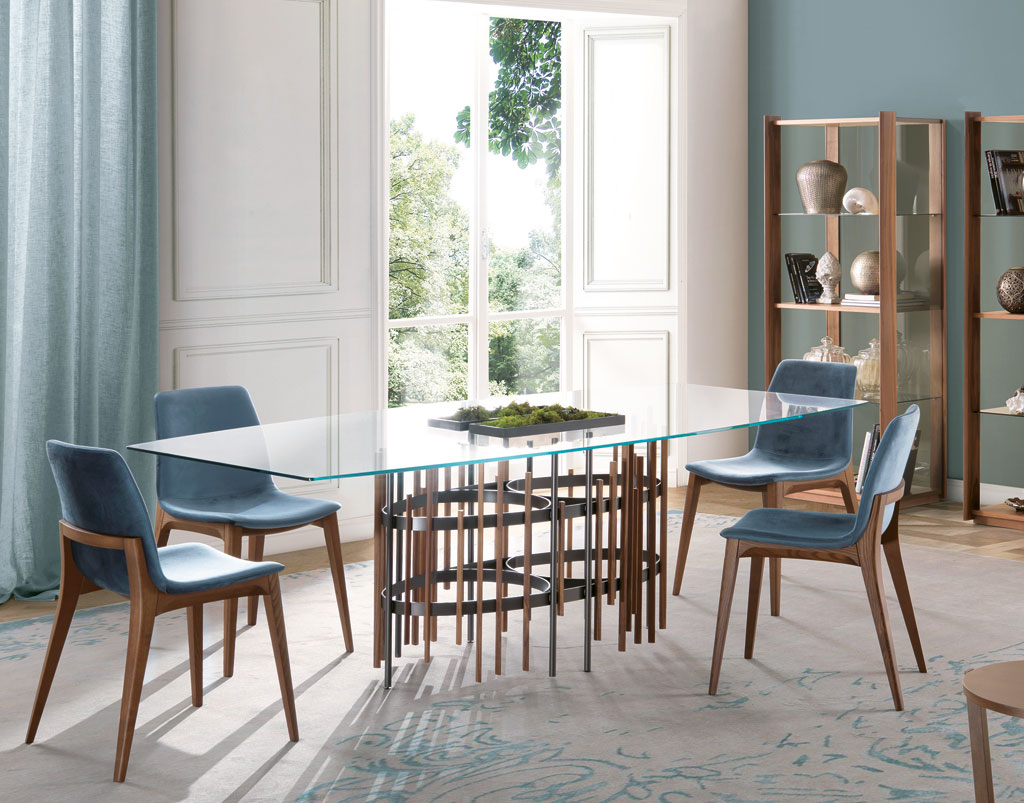 Il tavolo ha una base in metallo verniciato color titanio con inserti in massello di noce canaletto o frassino. Piano in vetro temperato naturale o bronzato trasparente con piastre elettrosaldate (10 o 12 mm).