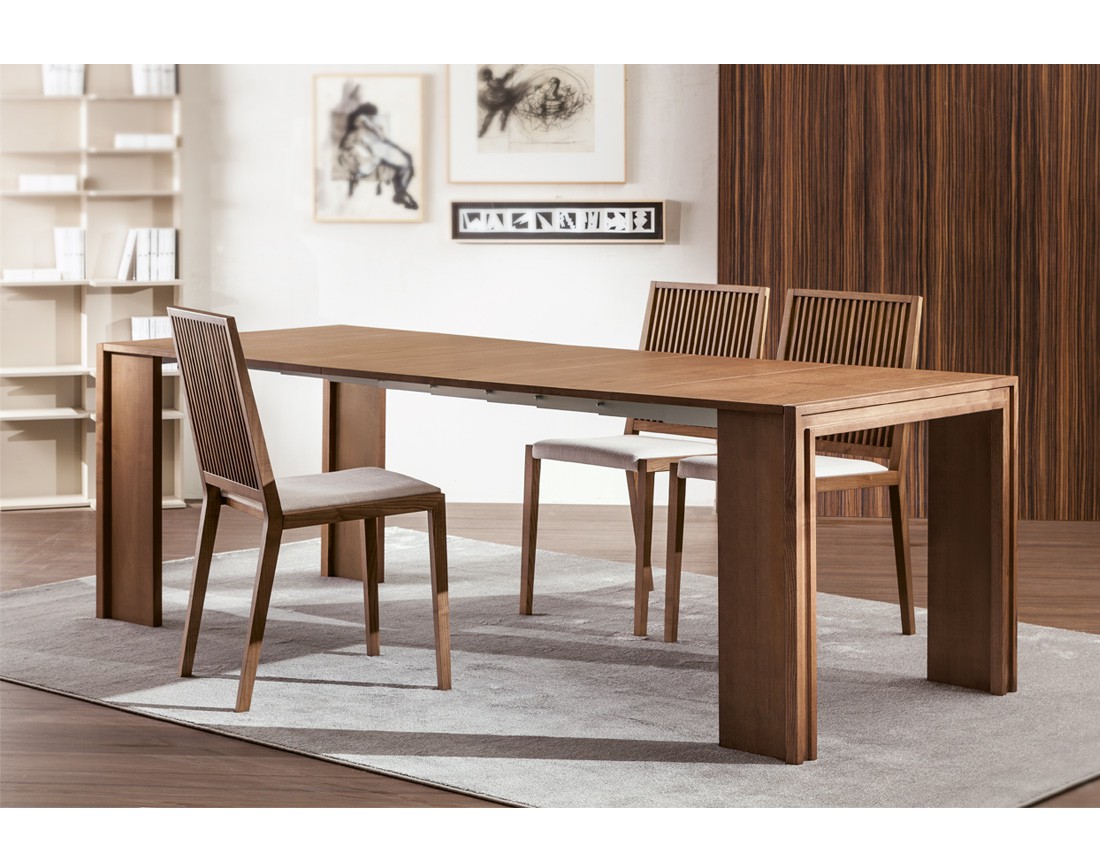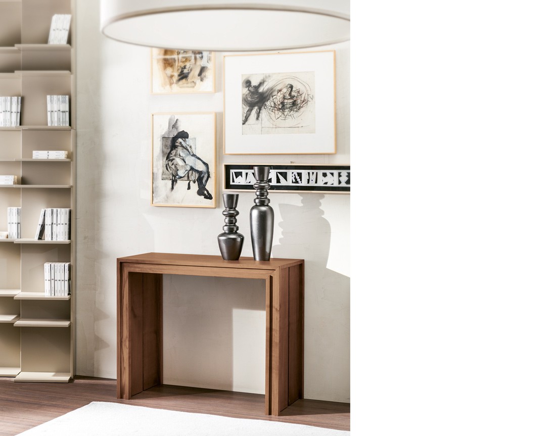 Tavolo-consolle allungabile con struttura in massello e piani placcati frassino. Dotato di 4 o 5 prolunghe per ottenere misure diverse meccanismo telescopico in alluminio. La versione 5426.2 è dotata di sostegno centrale. Finiture disponibili: WG wengé, NC noce, TB tabacco, laccato opaco poro aperto ( L21 bianco, L29 madreperla, L23 cappuccino, L25 grigio fumo, L22 nero, L24 rosso ).
