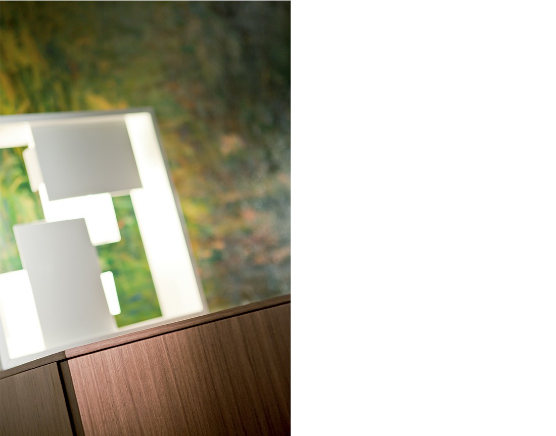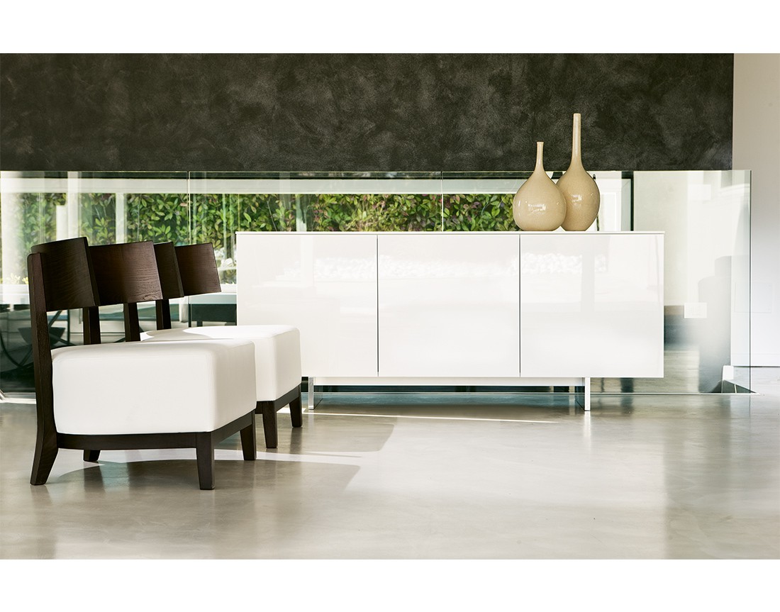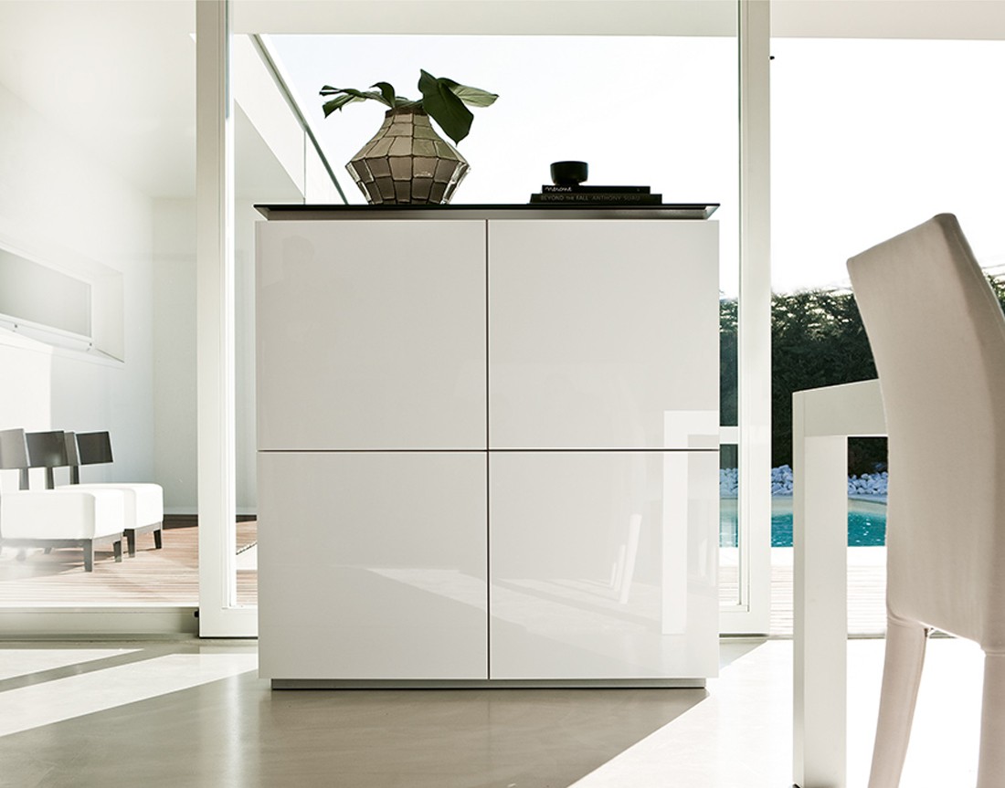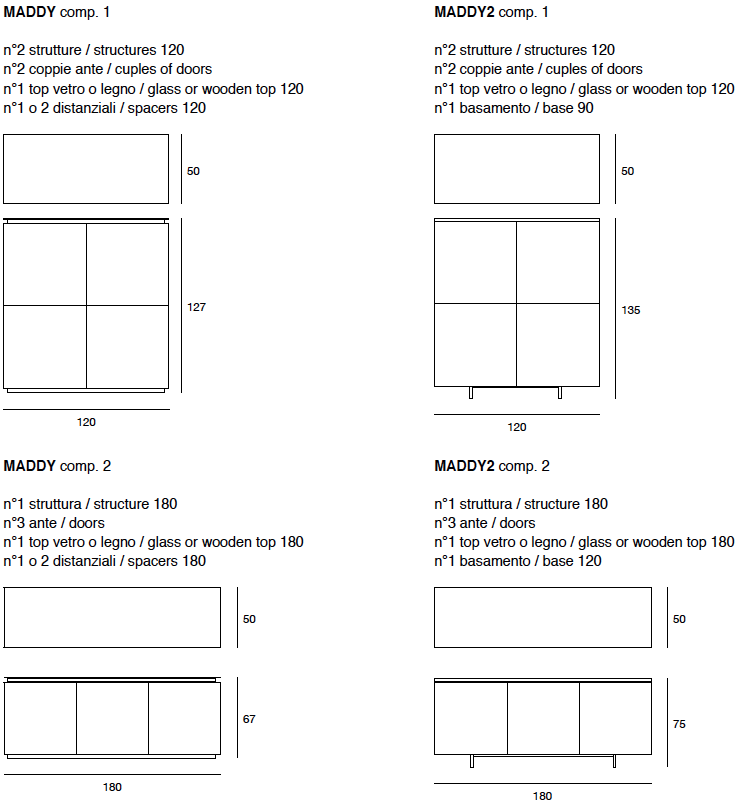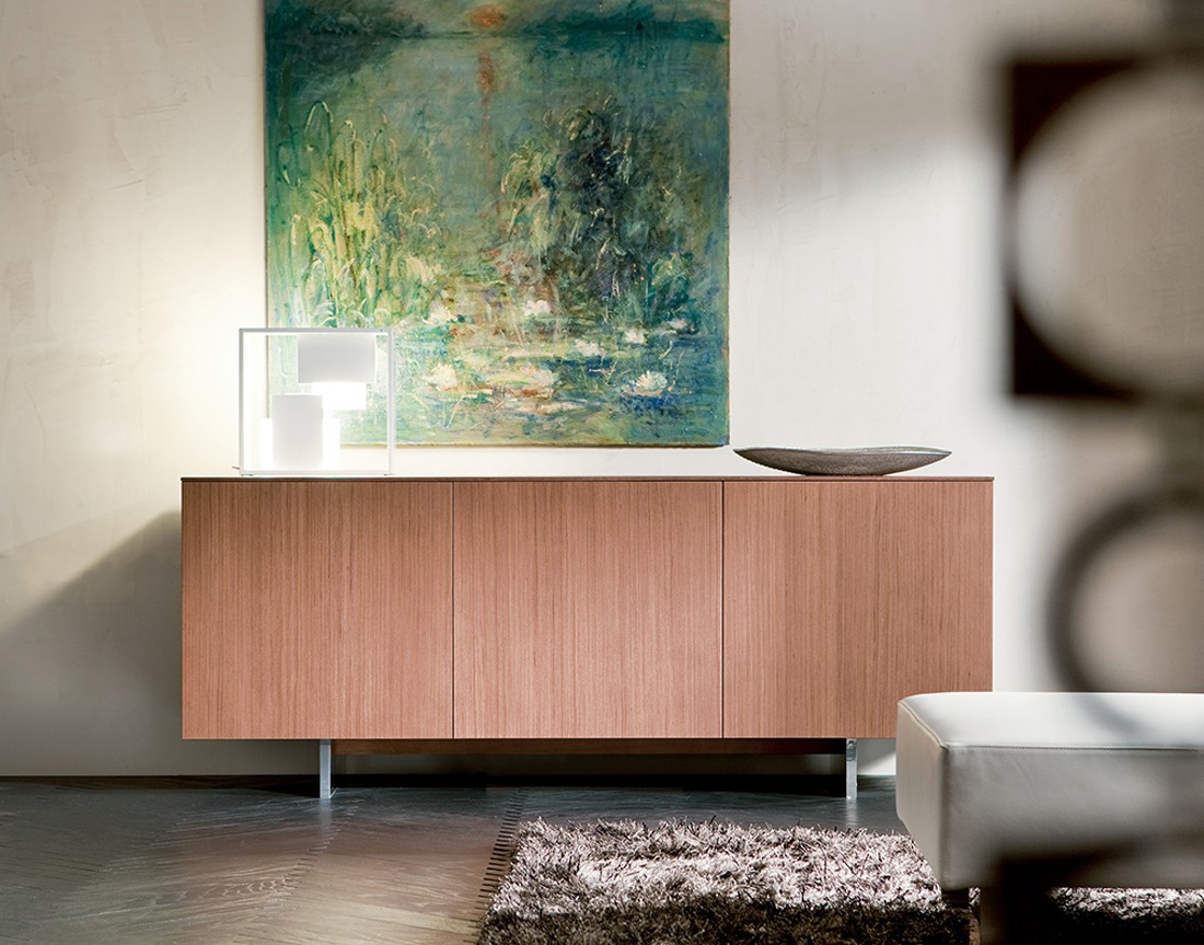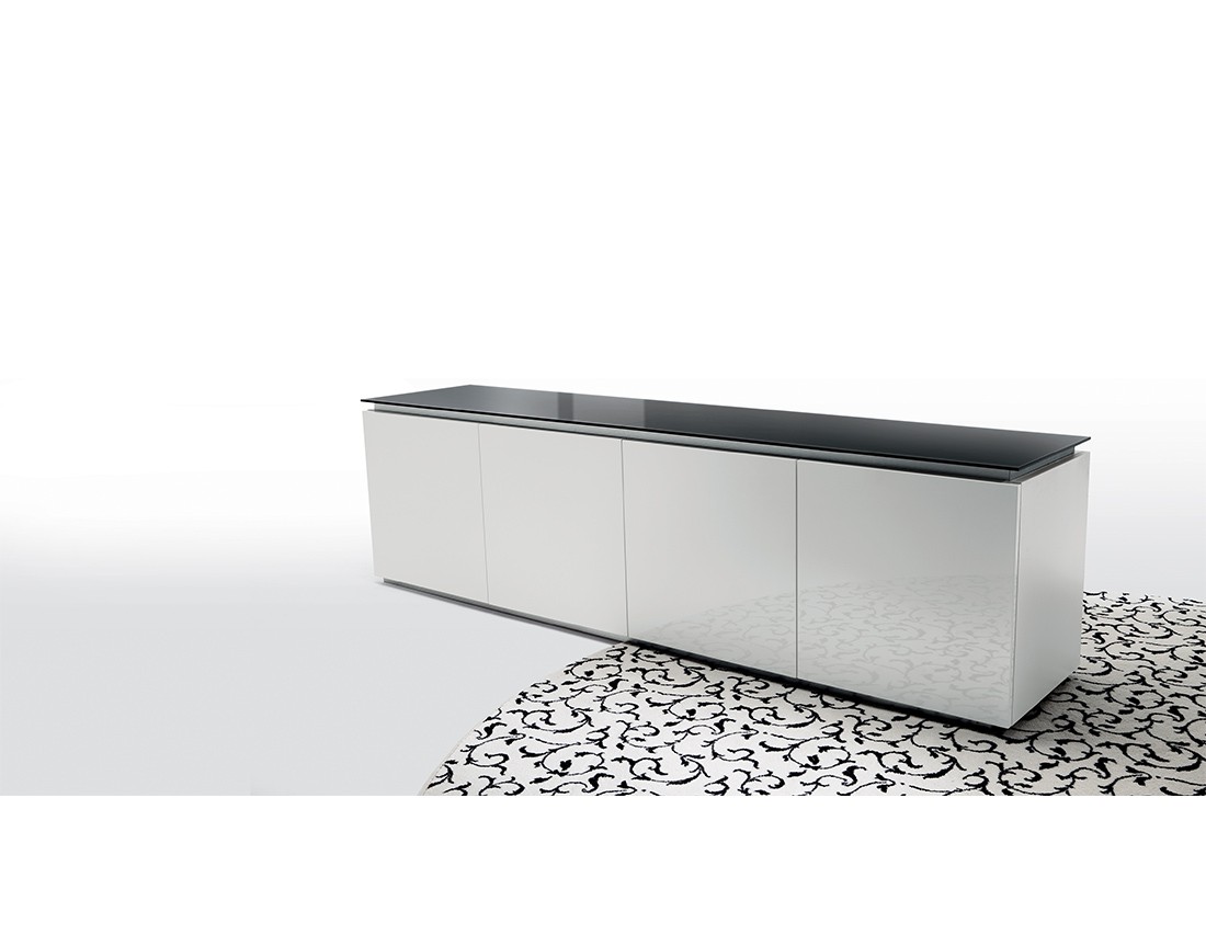 Madia a moduli con struttura e ante placcate o laccate nelle finiture della collezione. Piano superiore in legno o in vetro verniciato (extra chiaro bianco, nero o moka). Distanziale in alluminio o basamento in laminato specchiato. Finiture disponibili: WG wengé, NC noce, TB tabacco, laccato opaco poro chiuso ( L1 bianco, L19 madreperla, L3 cappuccino, L5 grigio fumo, L2 nero, L4 rosso, L40 beige microgoffrato, L41 ecrù microgoffrato, L42 fango microgoffrato), laccato brillante ( L6 bianco, L9 madreperla, L10 cappuccino, L11 grigio fumo, L8 nero, L7 rosso) disponibile solo per ante e top.