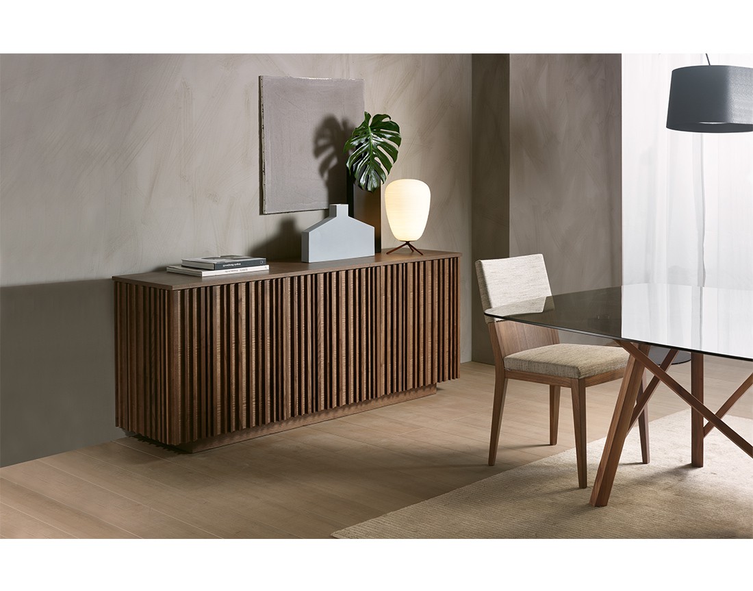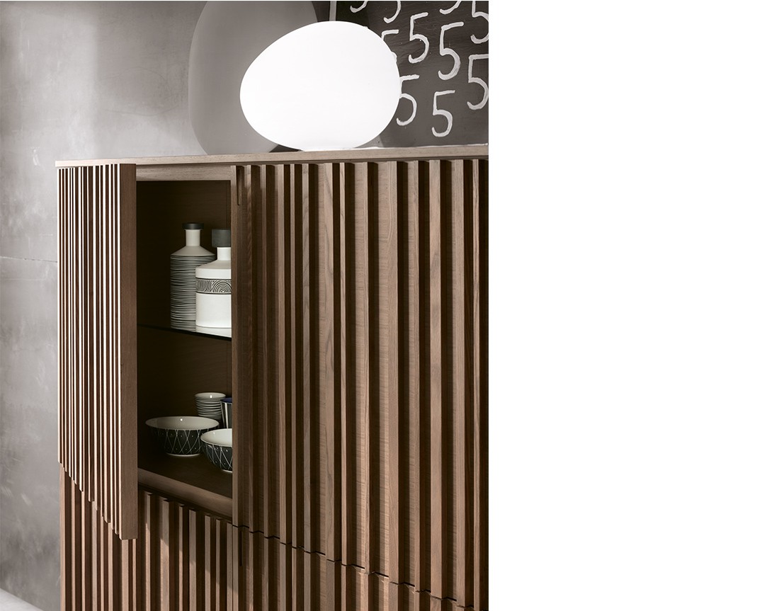 La sua preziosità ruota tutta attorno all’attenta e accurata lavorazione del legno massello di frassino, che disegna sulla superficie del mobile una texture originale di forte impatto visivo. Senza perdere le caratteristiche di simmetria e continuità – date anche dall’assenza di maniglie – Line è un oggetto adatto a dare sicurezza e insieme forza comunicativa a qualsiasi ambiente. La praticità, inoltre, incontra il gusto, grazie agli ampi vani contenitori dotati di ripiani in vetro naturale.a madia.