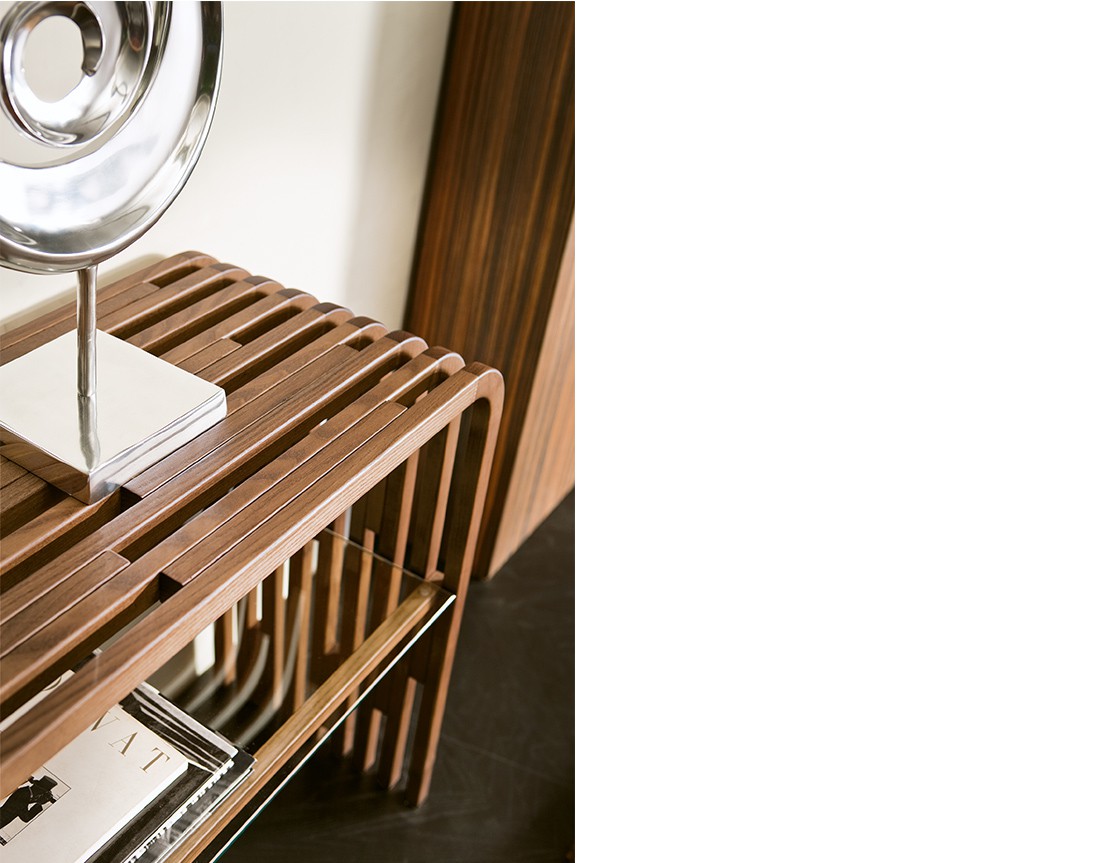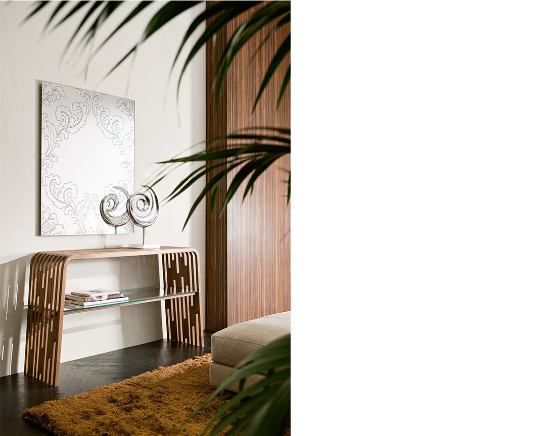 Consolle con struttura in massello di frassino. Ripiano in vetro naturale (sp. 8 mm). Finiture disponibili: FN frassino naturale, WG wengé, NC noce, TB tabacco.