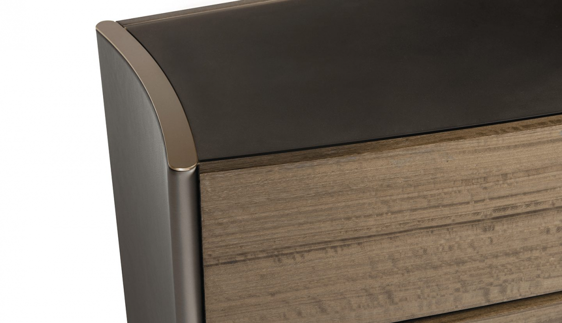 Il top è in specchio bronzo satinato mentre i fianchi sono rivestiti in pregiati pellami con bordatura di chiusura (sopra e sotto) in metallo oro satinato opaco.