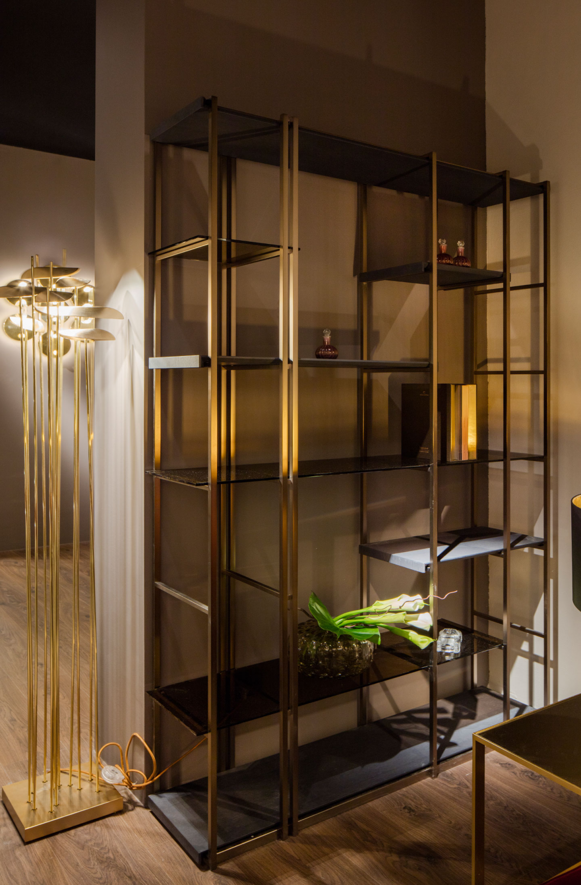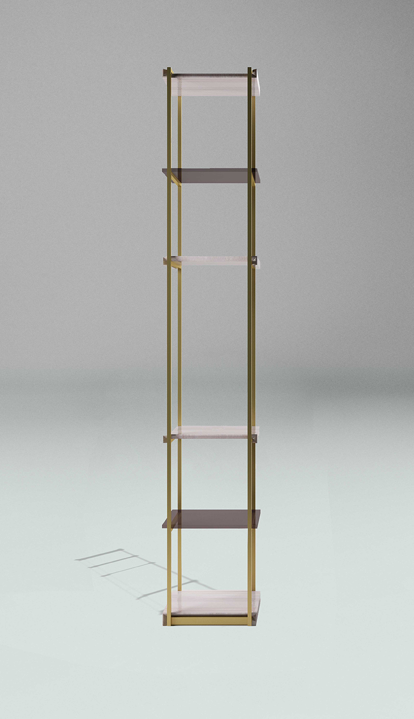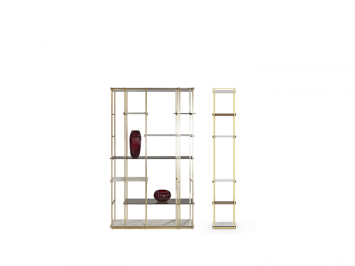 La versione in legno ha la struttura metallica in finitura Bronze Shadow opaco, ripiani in vetro color avana e legno di olmo cenere. Disponibili i modelli Socrate 35 e Socrate 130.